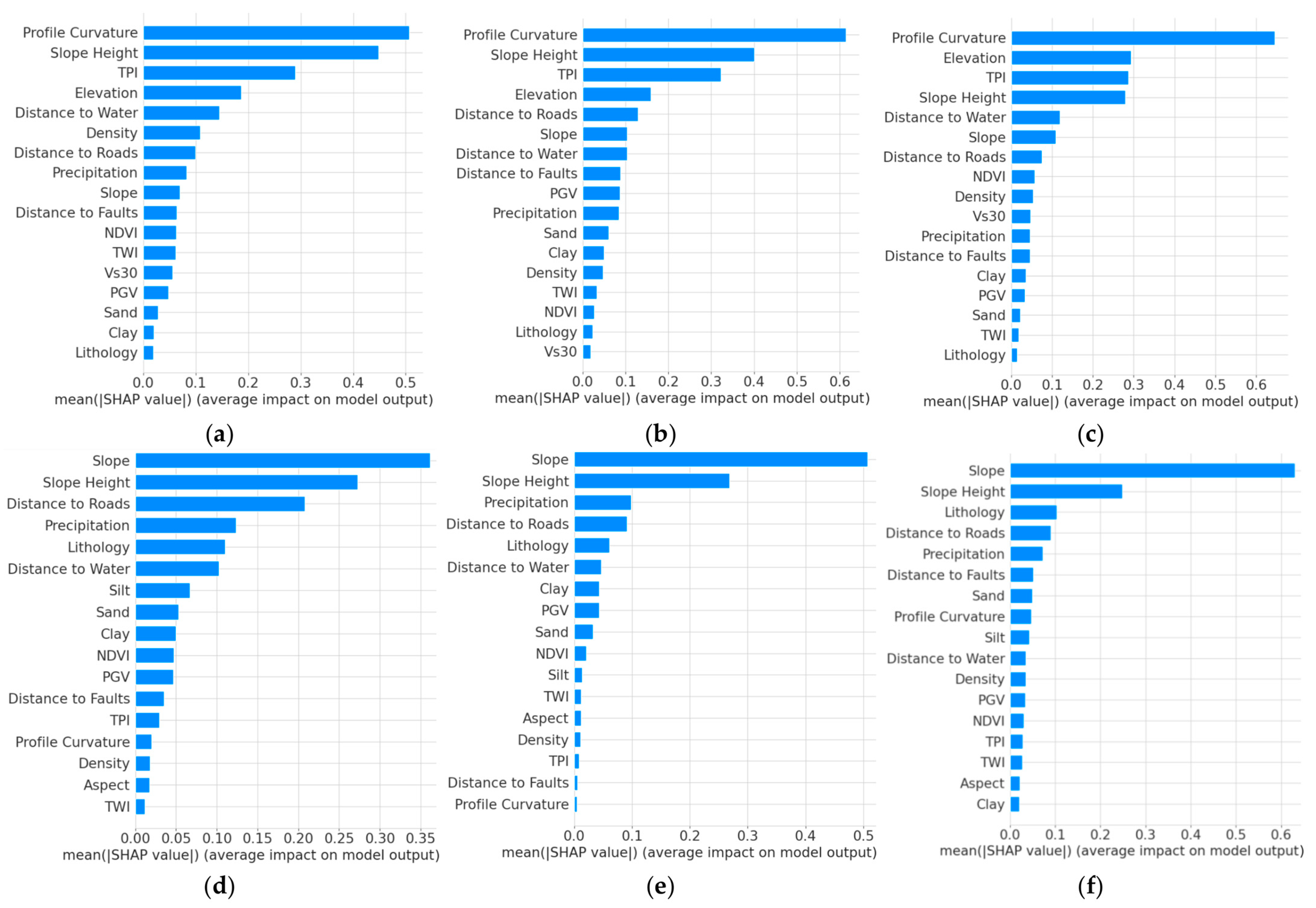 - Buffer-Based Strategy: SHAP plots reveal that the most influential features across all three models are profile curvature, slope height, elevation, and TPI.