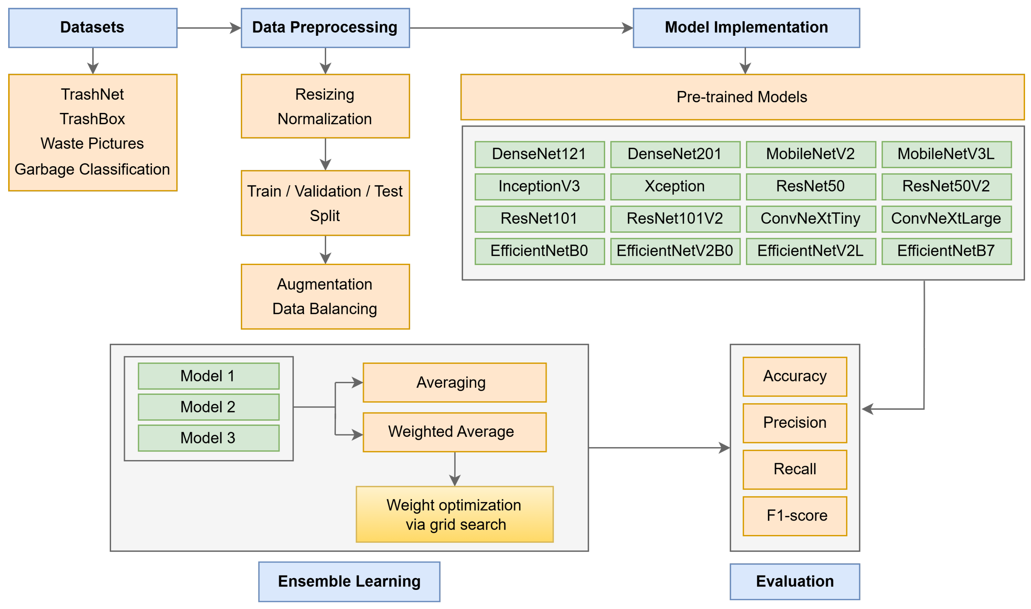 - We present efficient deep ensemble learning models, integrating pre-trained models with ensemble methods to provide more accurate results for waste management systems.