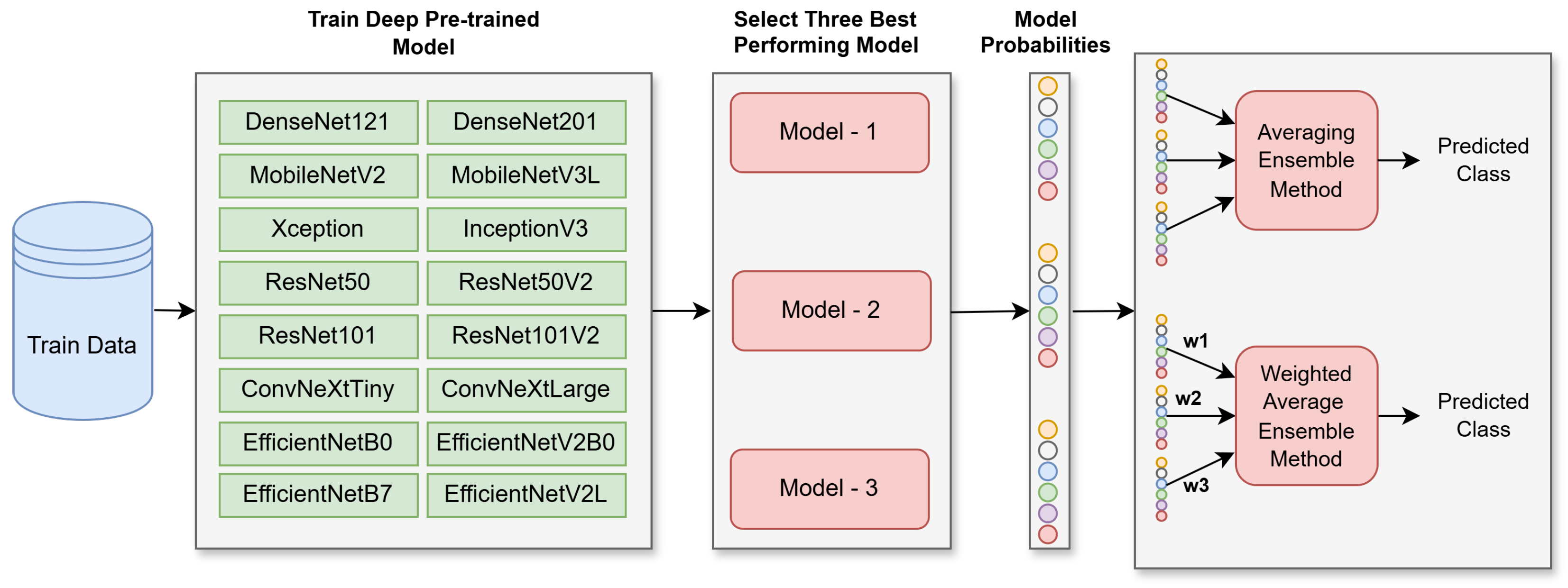 | Proposed model (weighted average ensemble) | EfficientNetB7, Xception, ConvNeXtLarge | 12 | 80/10/10 | 99.1 |