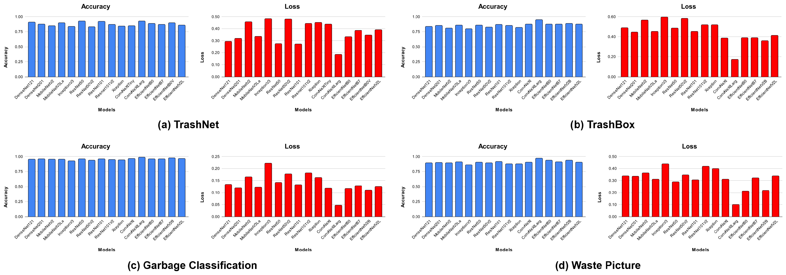 - We perform a comparative evaluation of the waste classification problem using sixteen different pre-trained DL models on four waste datasets.