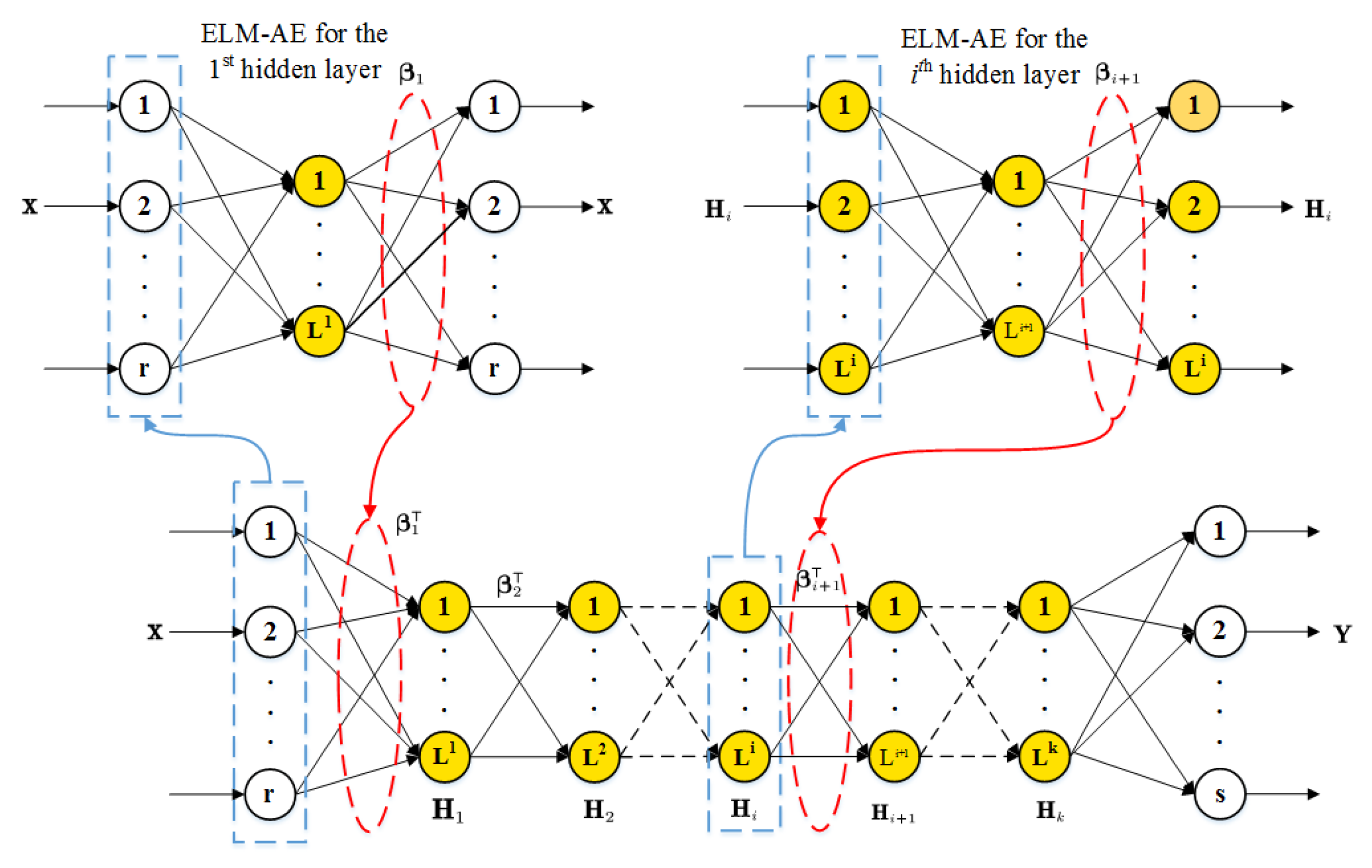 Figure 3. ML-ELM is a multi-layer feed forward neural network, which combines the high efficiency of ELM with the deep structure of auto encoder (ELM-AE for short). The input dimension of ELM-AE is the same as the output, so the unsupervised learning mode is naturally transformed into supervised learning mode [