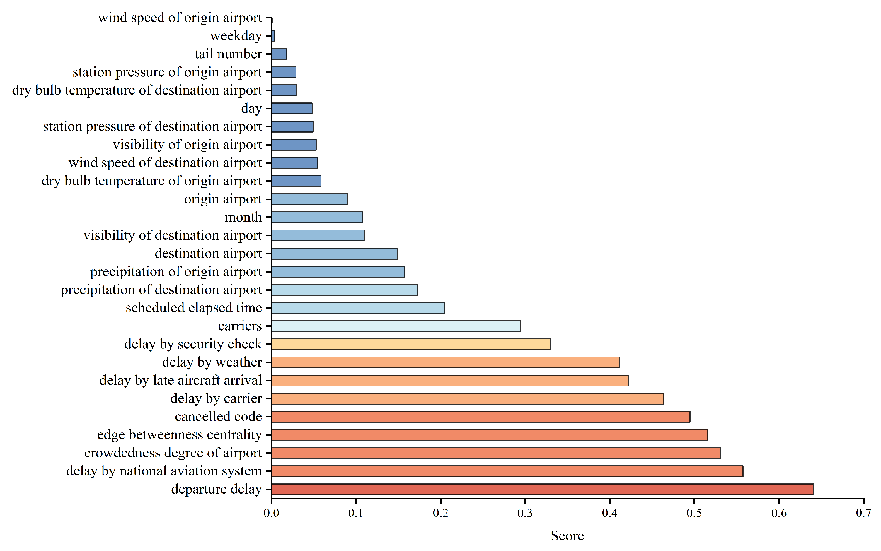 28]. Many features, such as weather conditions, air traffic volume, airport capacity, and historical delay patterns, have been tested and studied in the extant literature. This paper adopts a feature selection approach from a similarly large set of features, ensuring that the selected variables align with those commonly explored in prior studies (e.g., weather, traffic data, and departure delay) while also incorporating network-level attributes (e.g., node-specific airport characteristics and edge-specific features) to address multi-airport-multi-airline dynamics. For example, Choi et al. [