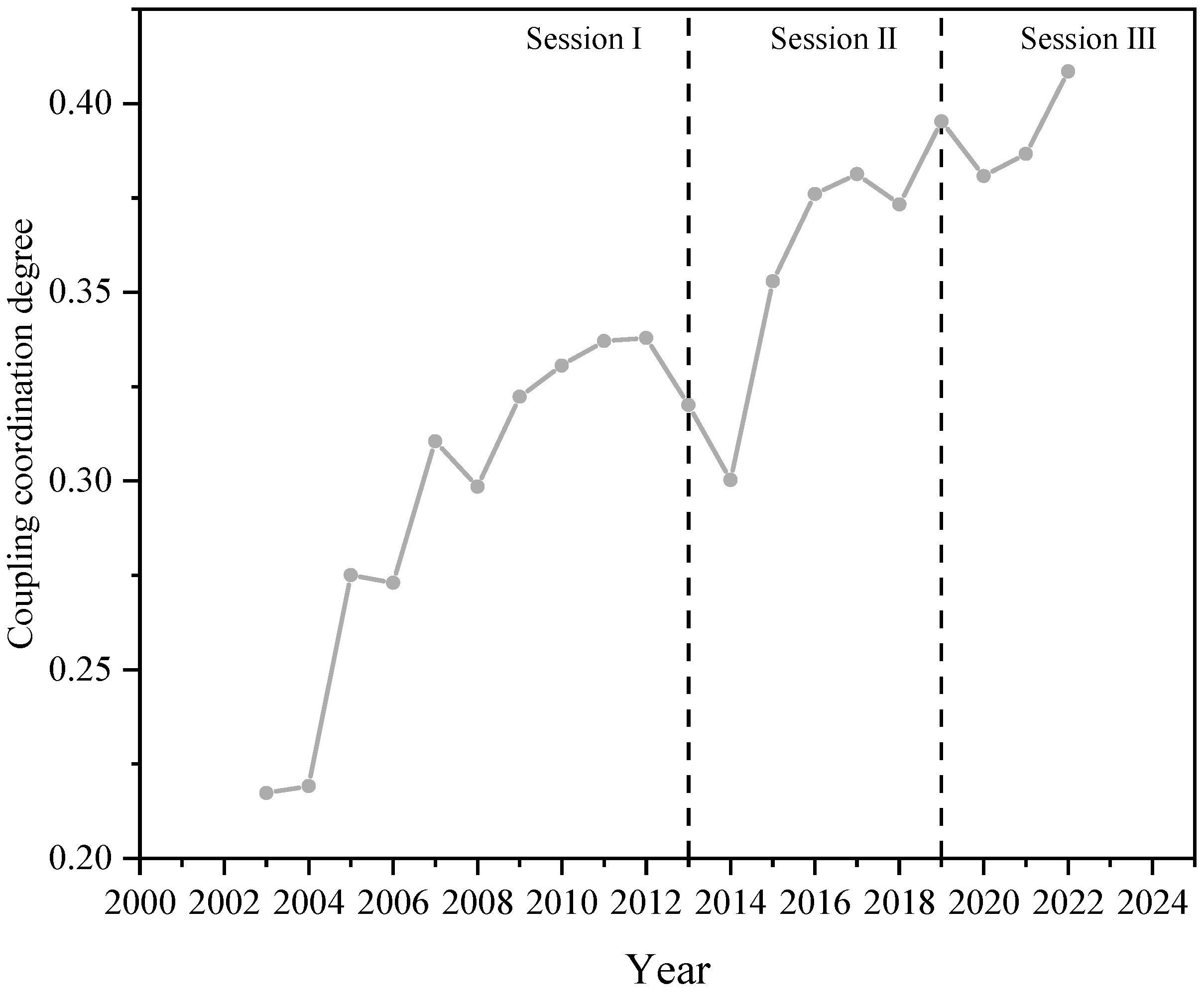 | Coupling Coordination Degree D | Type of Coordinated Development |
