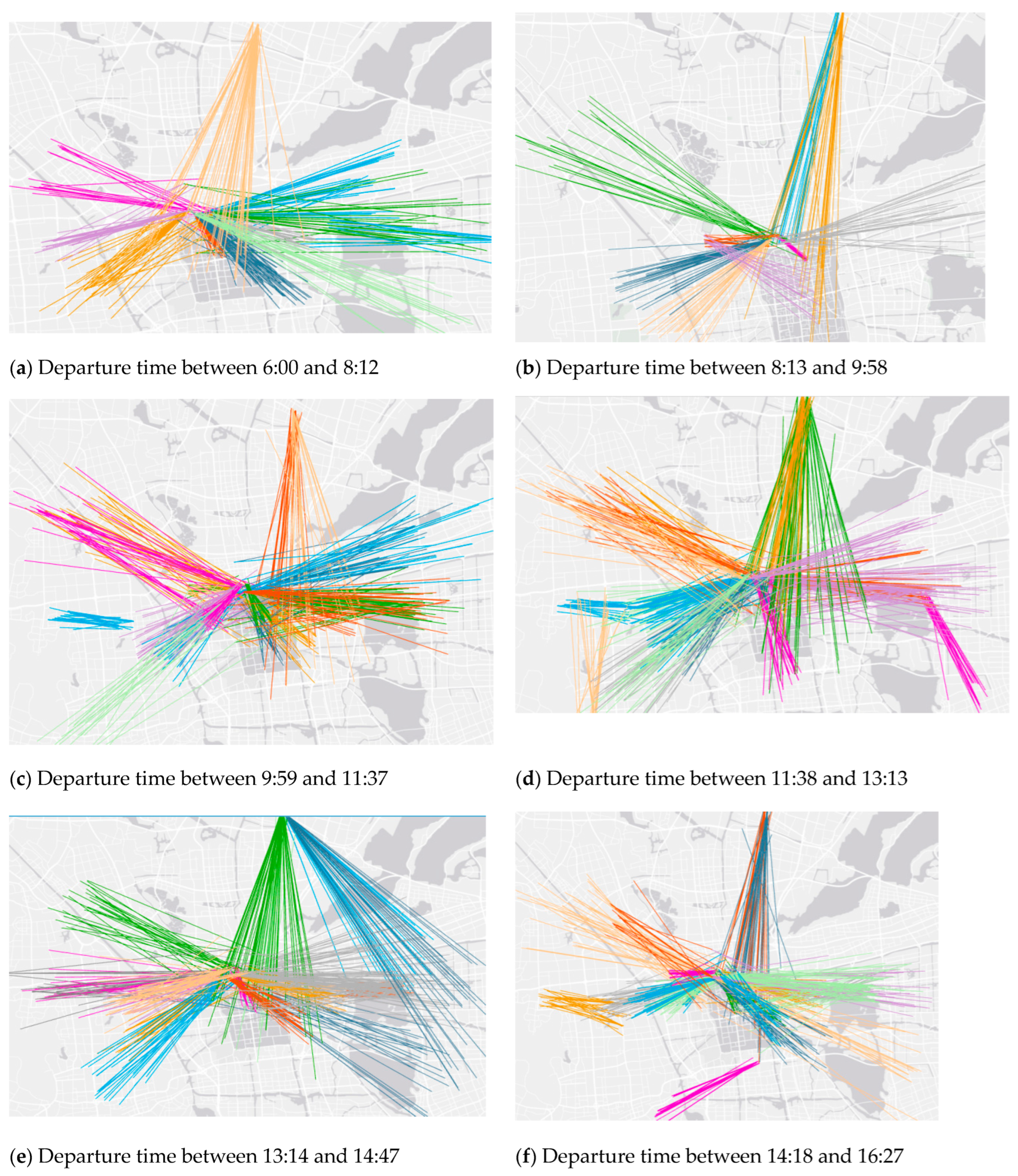 - Zhao, X.; Cui, M.; Levinson, D. Exploring temporal variability in travel patterns on public transit using big smart card data. Environ. Plan. B Urban Anal. City Sci. 2023, 128, 89–101. [Google Scholar] [CrossRef]