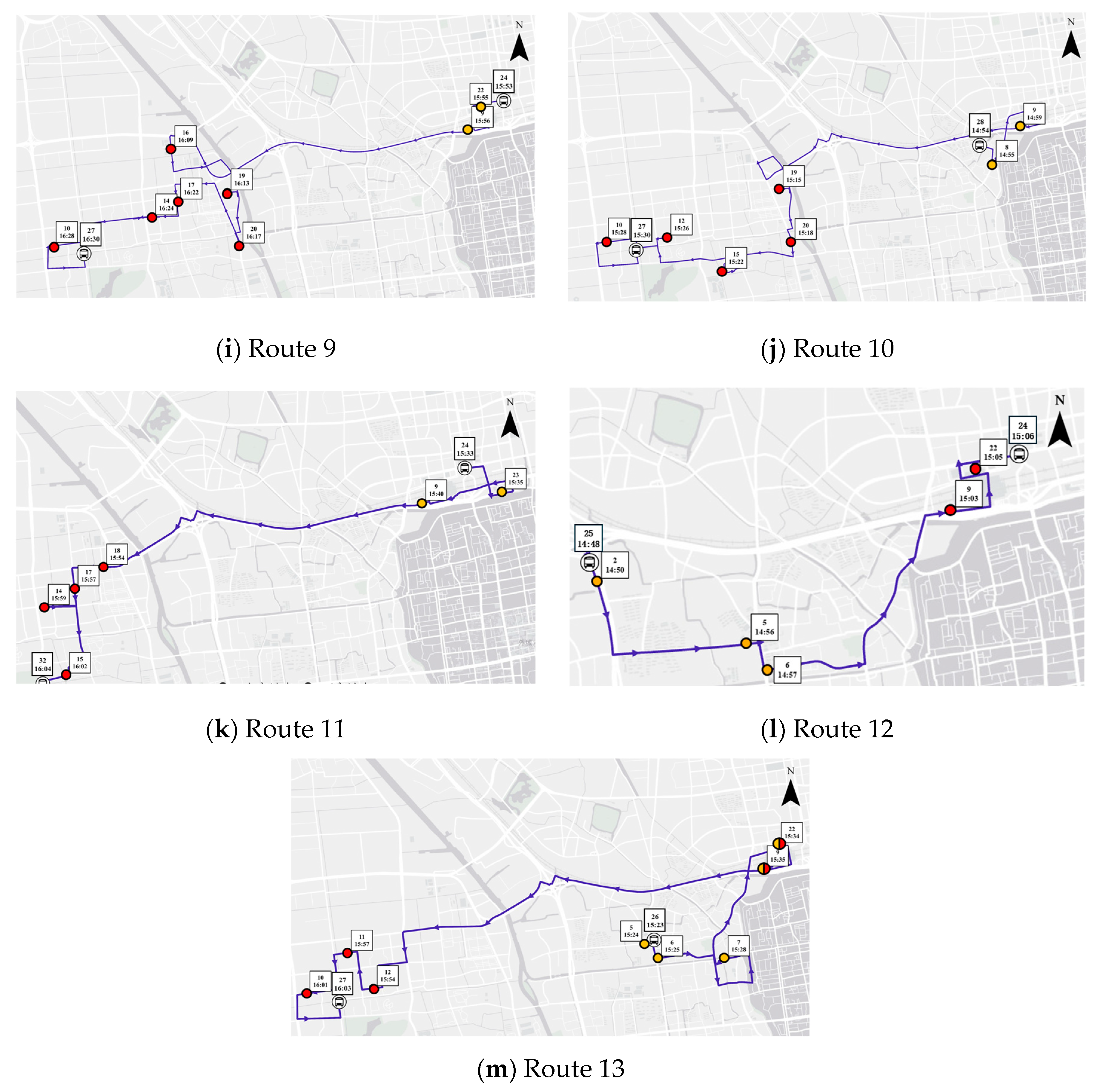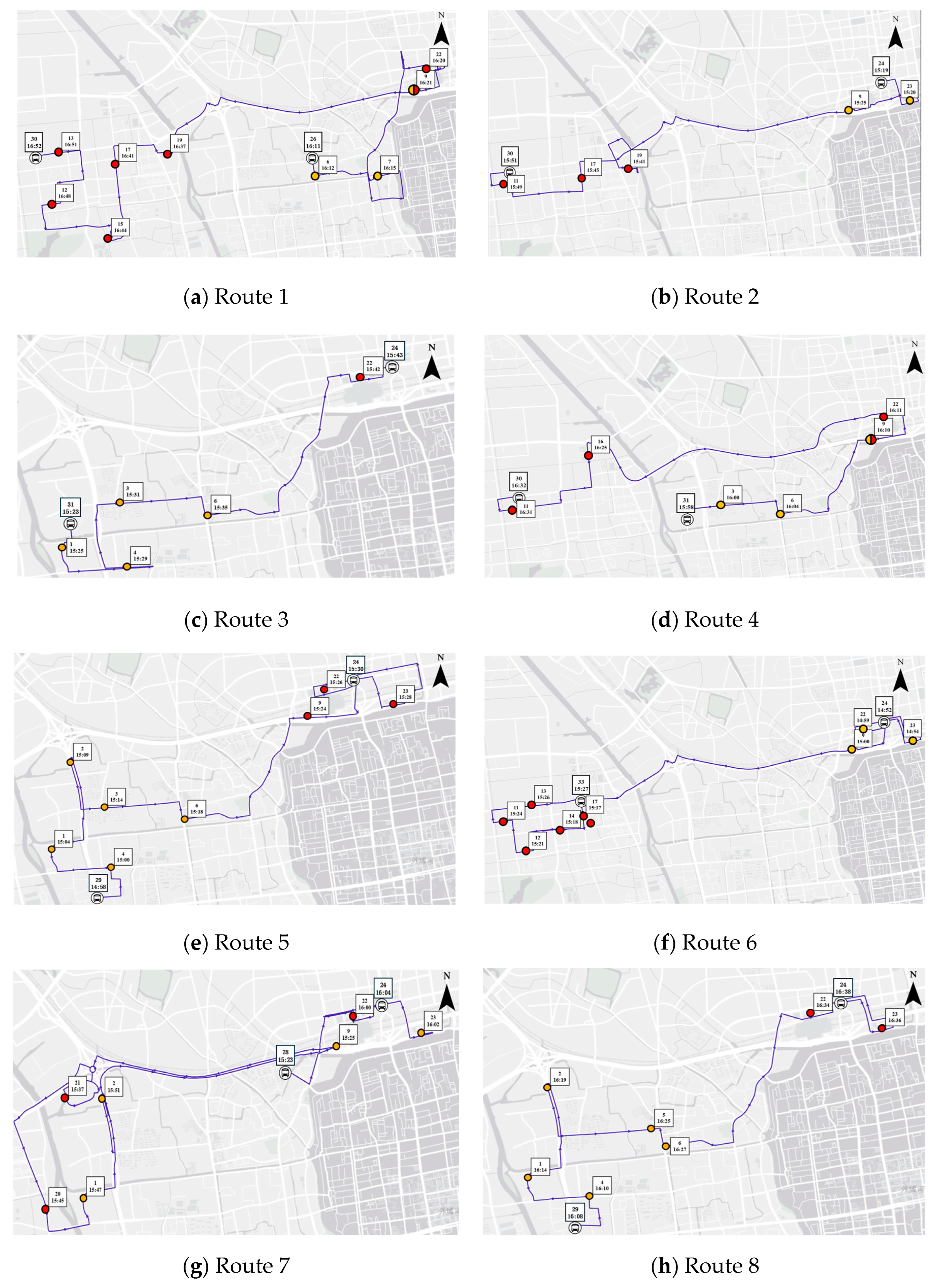 - Huang, A.; Dou, Z.; Qi, L.; Wang, L. Flexible route optimization for demand-responsive public transit service. J. Transp. Eng. Part A Syst. 2020, 146, 04020132. [Google Scholar] [CrossRef]