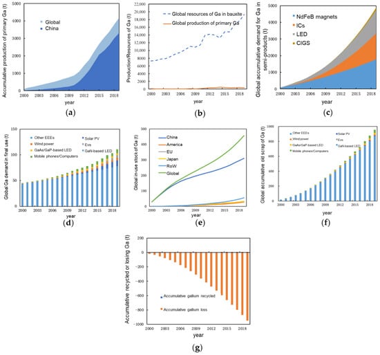 Figure 3a, the global cumulative primary gallium production was only 100 tons in 2000, increasing to 4179 tons by 2019, with an average annual growth rate of 21.7%. Among this, China’s cumulative primary gallium production accounted for a high proportion of 79% of the global total by 2019. In terms of gallium resources contained in global bauxite supplies, the supply potential of primary gallium resources is substantial. Referring to existing studies [