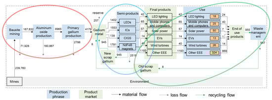 Figure 4 shows the cumulative material cycle process of gallium resources throughout their life cycle from 2000 to 2019, mainly including the gallium resource mining and smelting stage, gallium-containing component production and manufacturing stage, gallium end-product usage stage, and gallium resource waste management stage. From this, we can summarize three recycling opportunities for gallium and their respective recycling potentials.