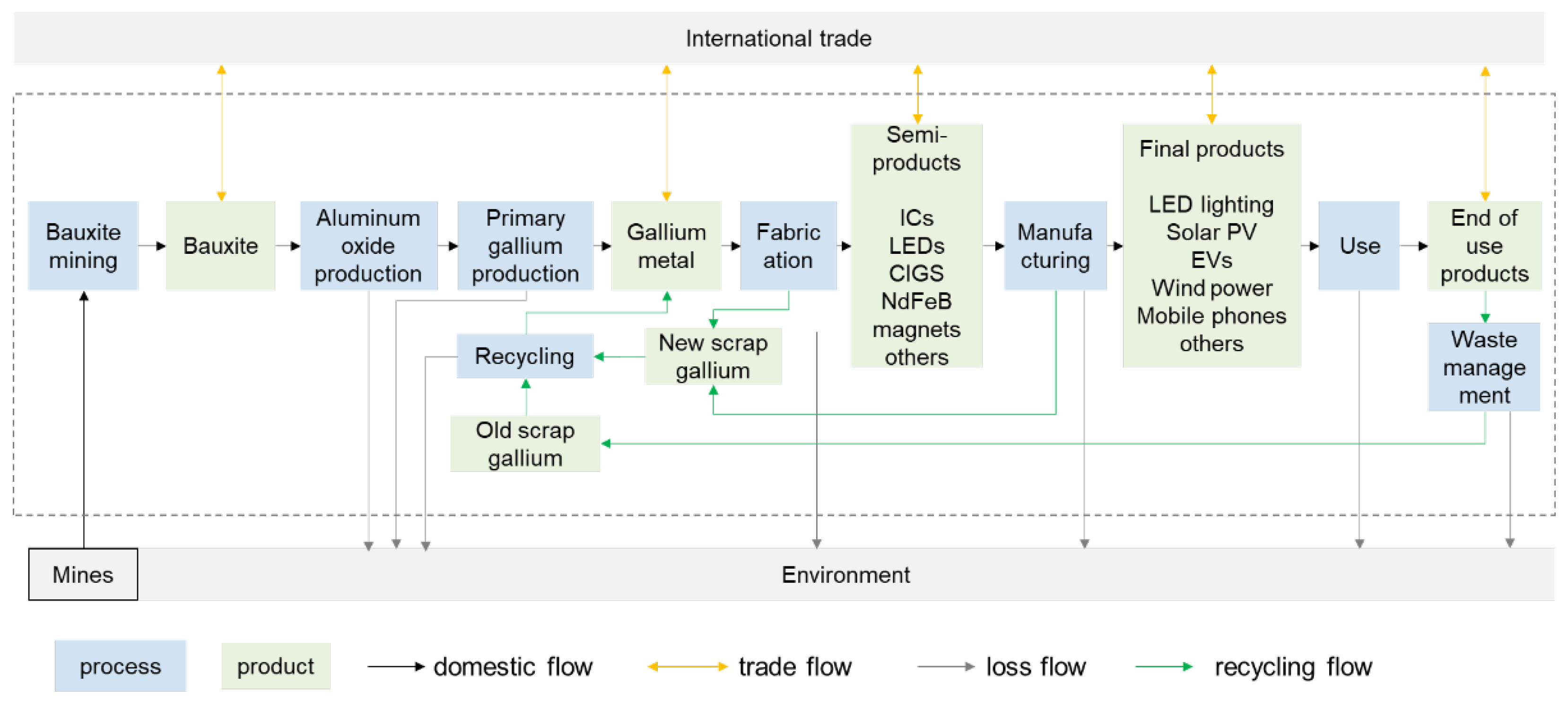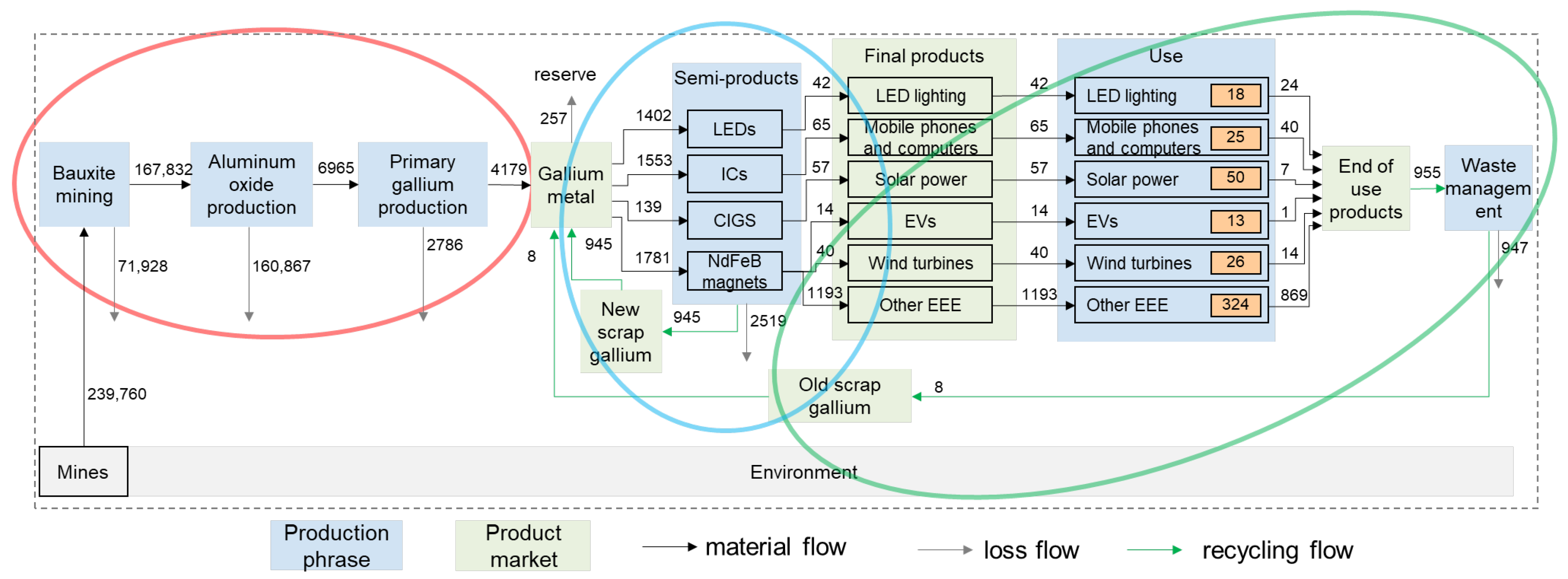 Recycling potential of old gallium scrap: Old gallium scrap refers to gallium recovered from EoL products, such as smartphones, computers, and LED devices. These products typically have relatively short life cycles, meaning that when they are discarded, a large amount of gallium ends up in landfills or other waste management systems. In 2019, the global stock of discarded gallium-containing products was approximately 955 tons. However, only 8 tons of old gallium scrap were recycled, with a recovery rate of less than 1%. The stark contrast between the amount of discarded gallium and the amount recycled demonstrates the huge untapped potential for improving recycling from EoL products.