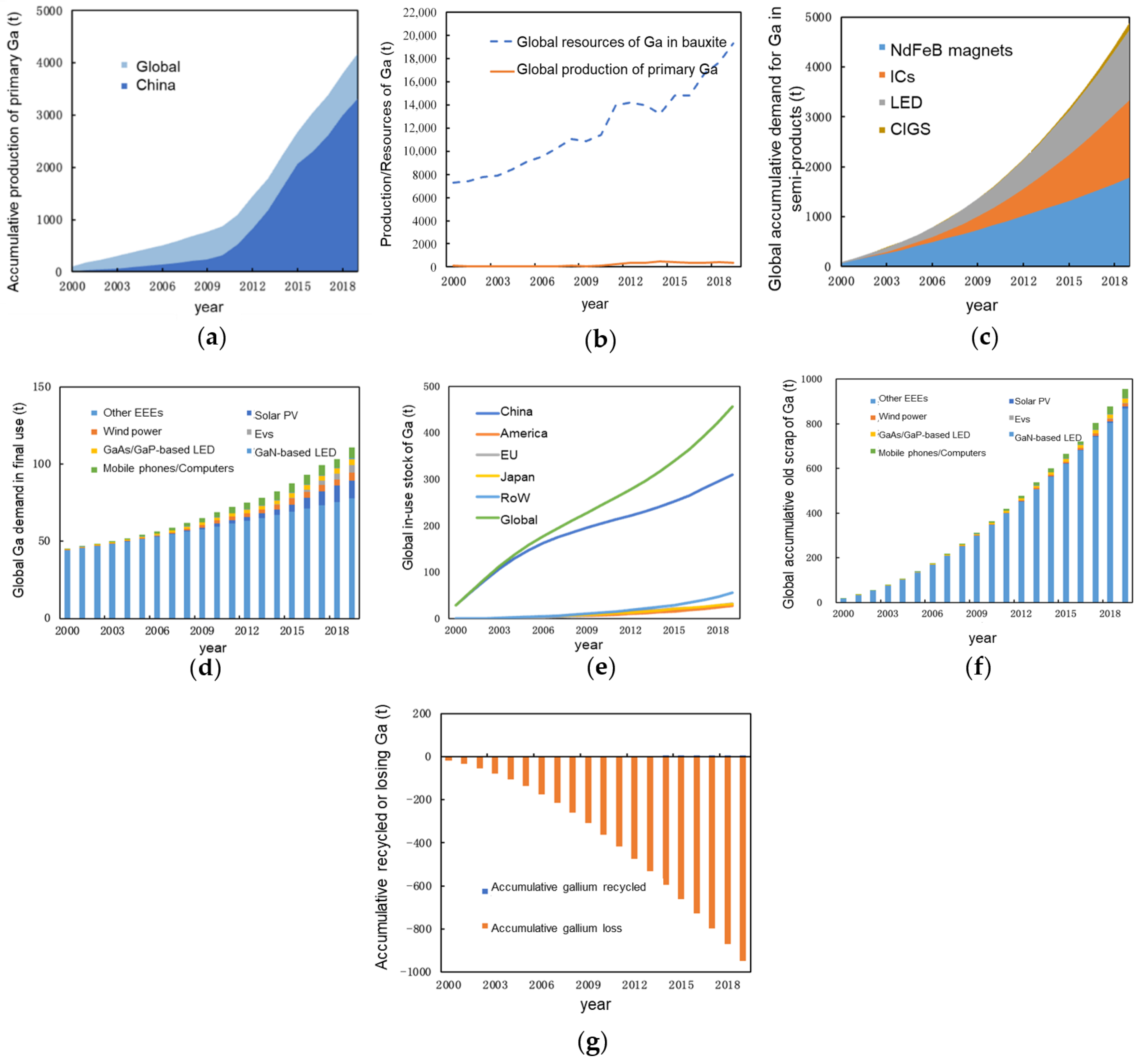 Figure 3g, in recent years, the cumulative recovery of old gallium scrap has been 8 tons, far lower than the 955 tons of old gallium scrap generated. This means that during the waste management stage, the recovery rate of gallium resources from discarded products is extremely low, with the recovery amount accounting for only 0.84% of old gallium scrap production, resulting in a large amount of gallium resources being lost during waste management.