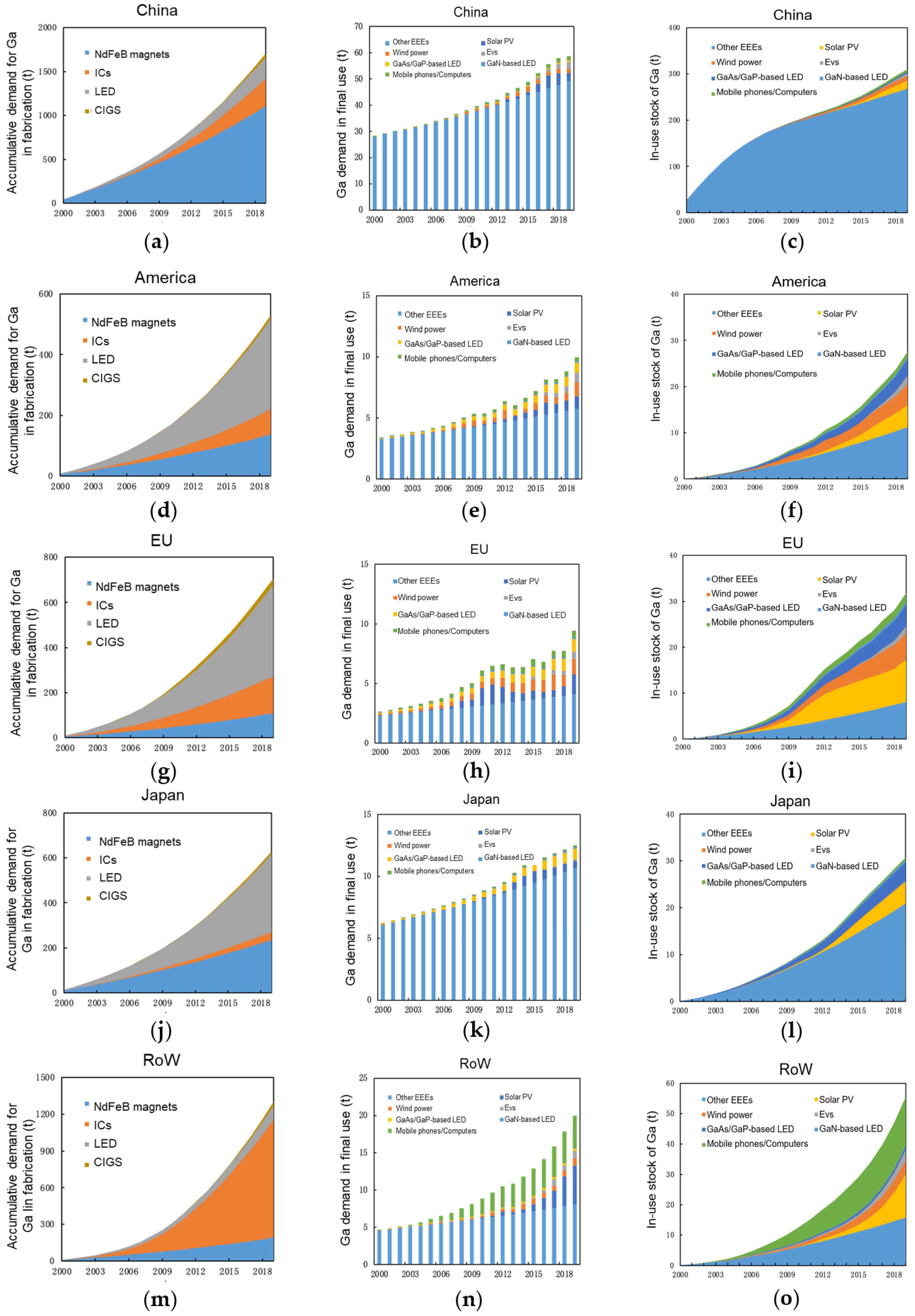 Figure 5m). In 2000, gallium demand for IC chip manufacturing in this region was less than 10 tons, but by 2019, the cumulative gallium demand in this field had risen to 958 tons, accounting for 73% of the cumulative gallium demand in the rest of the world, with an average annual growth rate of 42%. In terms of end-product demand (