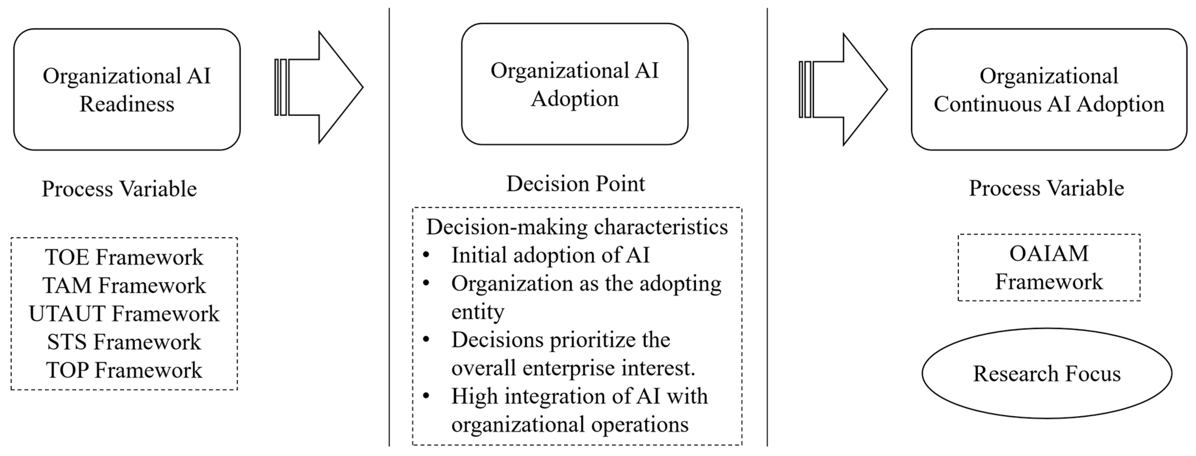 8], sometimes costing more due to the specificity of the AI system and the actual development of the organization. Therefore, mastering organizational AI adoption effectively is more of an art, and the theoretical underpinnings of this practice are not yet a mature framework, and measuring an organization’s digital progress by simple adoption or non-adoption is biased. However, organizational AI adoption has become an inevitable trend for almost all companies that are about to undergo digital transformation or have already completed it. The academic community has provided a rich array of theoretical lenses for understanding technology adoption. Classic models such as the Technology Acceptance Model (TAM) and the Technology-Organization-Environment (TOE) framework have made foundational contributions to explaining the factors influencing whether organizations adopt AI. However, this study contends that existing research suffers from a fundamental limitation: its static and cross-sectional nature. From a static perspective, models like TAM and TOE resemble taking a “static snapshot” of an organization’s AI journey, primarily focusing on pre-adoption decision factors such as perceived usefulness, technological readiness, and external pressure. They fail to address a more pertinent question: after making the initial adoption decision, how should organizations evaluate and manage their subsequent adoption process? Current literature critically lacks a dynamic framework capable of systematically assessing an organization’s sustained AI adoption level. There is an urgent need for a model that transcends the binary “yes/no” dichotomy, functioning like a “dashboard” to diagnose an organization’s stage along the path to deep AI integration and reveal the evolutionary trajectory from “immature” to “mature”. In contrast, the proposed Organizational AI Adoption Maturity (OAIAM) Model is dynamic and post-adoption-oriented. Unlike TAM and TOE which only focus on pre-adoption decision factors, or ISCM which merely lists influencing factors without outcome categorization, the OAIAM model integrates two complementary dimensions to capture staged progression and provide tailored strategic guidance. These are advantages that traditional models lack. Existing maturity models fail to capture three critical elements: the dynamic evolutionary nature of AI adoption, the synergistic effect of adoption depth and width, and clear pathways for sustained optimization. The absence of such a framework leaves management practice facing a challenge of guidance deficiency. Organizations struggle to discern: Where do we currently stand? In which direction should we strive next? What differentiated strategies should be adopted at different stages? This uncertainty frequently leads to misallocation of resources and strategic vacillation.
