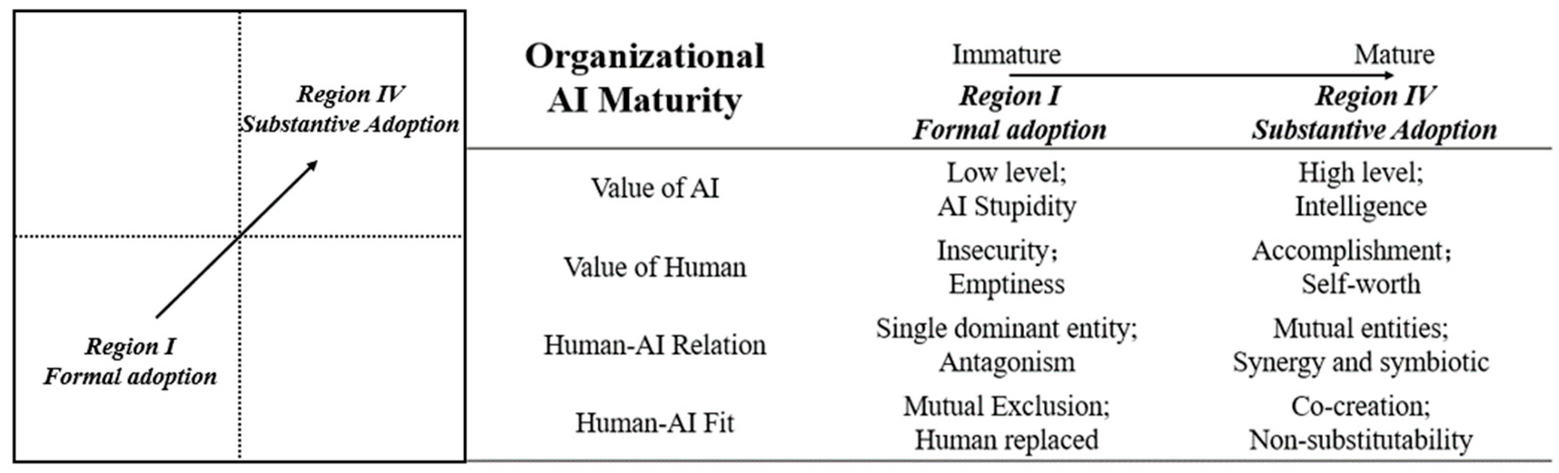At this juncture, the human–AI relationship is often adversarial, characterized by a struggle for control where one party dominates the other. In this dynamic, AI serves as a tool whose usability and complexity can vary. When the tool’s complexity exceeds the task’s requirement, or reaches a certain level, the effects of AI may prove counterproductive. This can result in a reduction in the level of acceptance of AI among humans. In the latter state, AI, with its automation and augmentation functions, may prove inadequate in meeting the expectations of its developers. Alternatively, it may supplant human labor through automation and intensify the pressure on employees to enhance productivity through its augmentation capabilities, thereby imposing inhumane machine standards. This human–AI conflict poses a significant risk at this stage, potentially eroding trust, impairing task efficiency, and ultimately hindering the full realization of value for both, thereby jeopardizing the evolution of organizational AI adoption maturity.