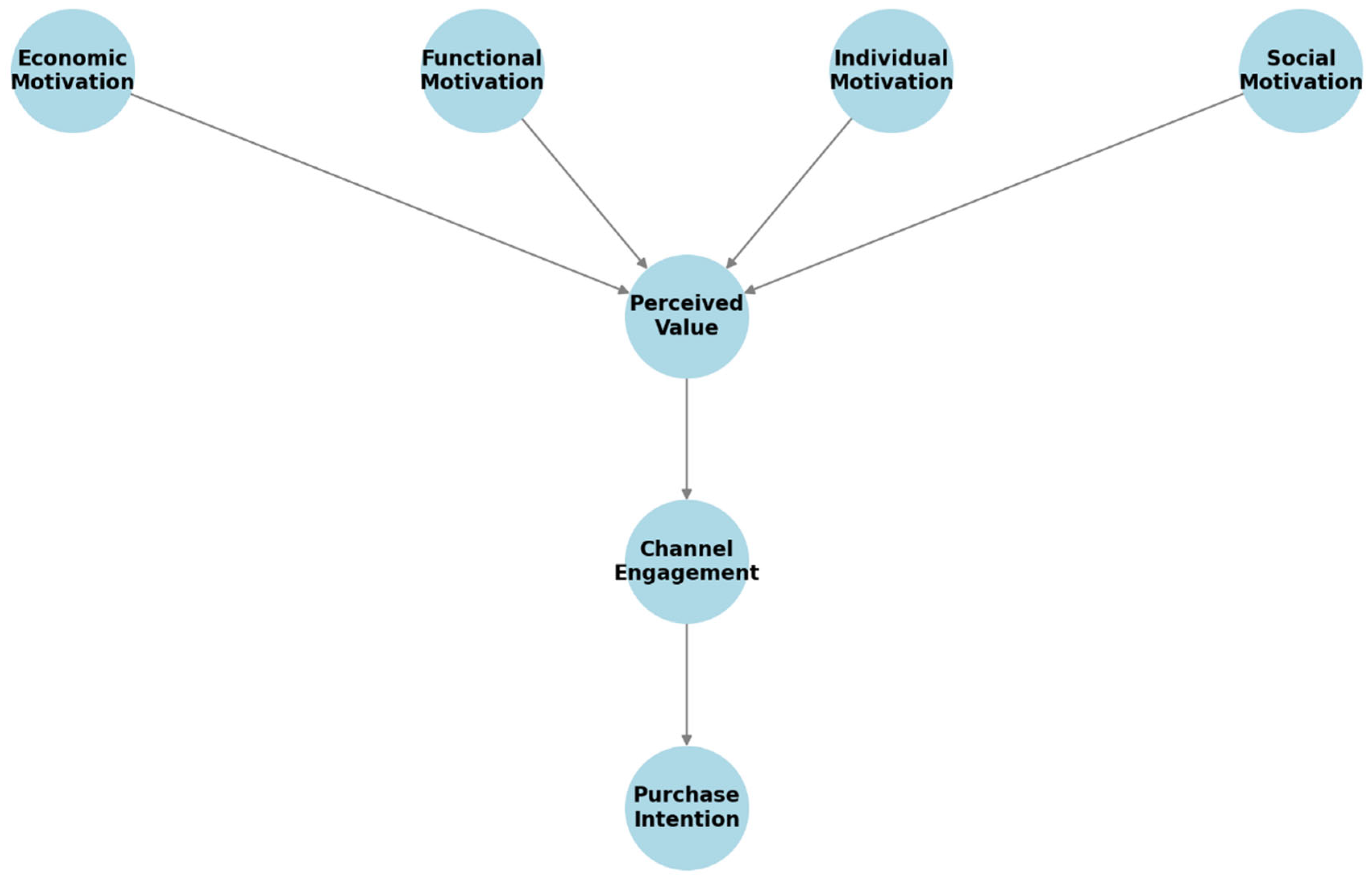 - H6 (Channel Engagement→Purchase Intention): Engagement significantly predicted purchase intention (β = 0.47, p < 0.001), supporting the assertion that involvement with the shopping environment—through browsing, interacting, or following sellers—increases the likelihood of eventual purchase.