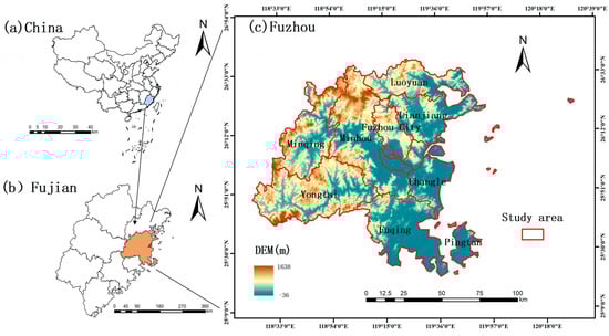 Fuzhou is the provincial capital of Fujian Province, located in the central-eastern part of Fujian (Figure 1), between latitudes 25°15′ N and 26°39′ N and longitudes 118°08′ E and 120°31′ E. The city covers an area of 11,968.53 km2 and administers six districts: Gulou, Cangshan, Taijiang, Mawei, Jin’an, and Changle, along with six counties—Luoyuan, Minqing, Yongtai, Pingtan, Lianjiang, and Minhou—and the city of Fuqing. Fuzhou’s topography is characteristic of a river delta basin, comprising plains, hills, and mountain ranges. The annual average precipitation ranges from 900 to 2100 mm [26]; The annual average temperature ranges from 20 to 25 °C. The coldest months are January and February, with average temperatures reaching 6 to 10 °C. The hottest months are July and August, with average temperatures of 33 to 37 °C. The highest recorded temperature reached 42.3 °C. In 2013, Fuzhou was ranked as the most sweltering city among China’s four major ‘furnaces’, frequently experiencing the urban heat island effect. Its basin-like topography contributes to midday temperatures exceeding 36 °C during summer. Consequently, this study selects Fuzhou City as its research area.