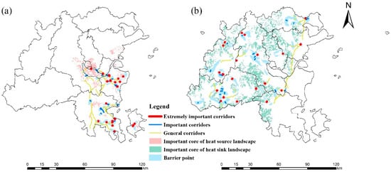The important sources, corridors and barrier points: (a) represents the heat source landscape; (b) represents the heat sink landscape.
