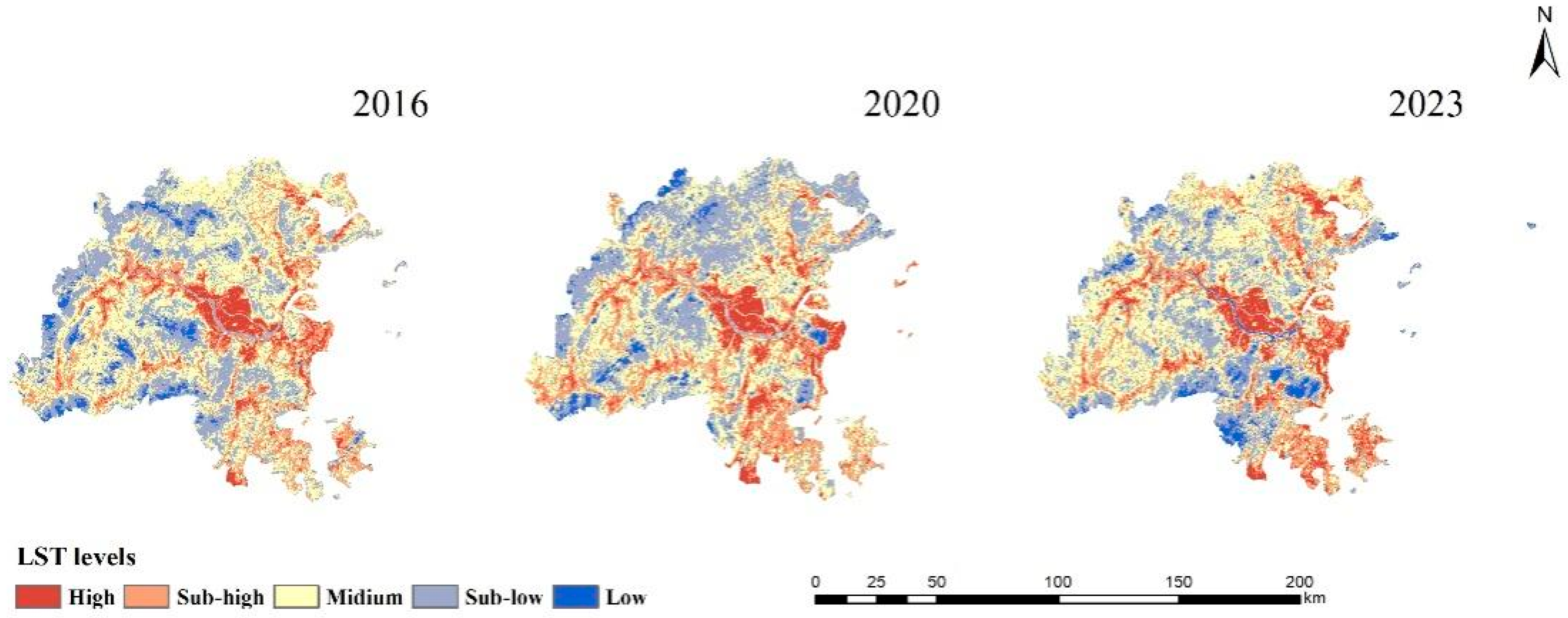 - Hu, Y.; Chen, J.; Jiang, Z.; He, J.; Zhao, Y.; Sun, C. Spatiotemporal Regulation of Urban Thermal Environments by Source–Sink Landscapes: Implications for Urban Sustainability in Guangzhou, China. Sustainability 2025, 17, 7655. [Google Scholar] [CrossRef]