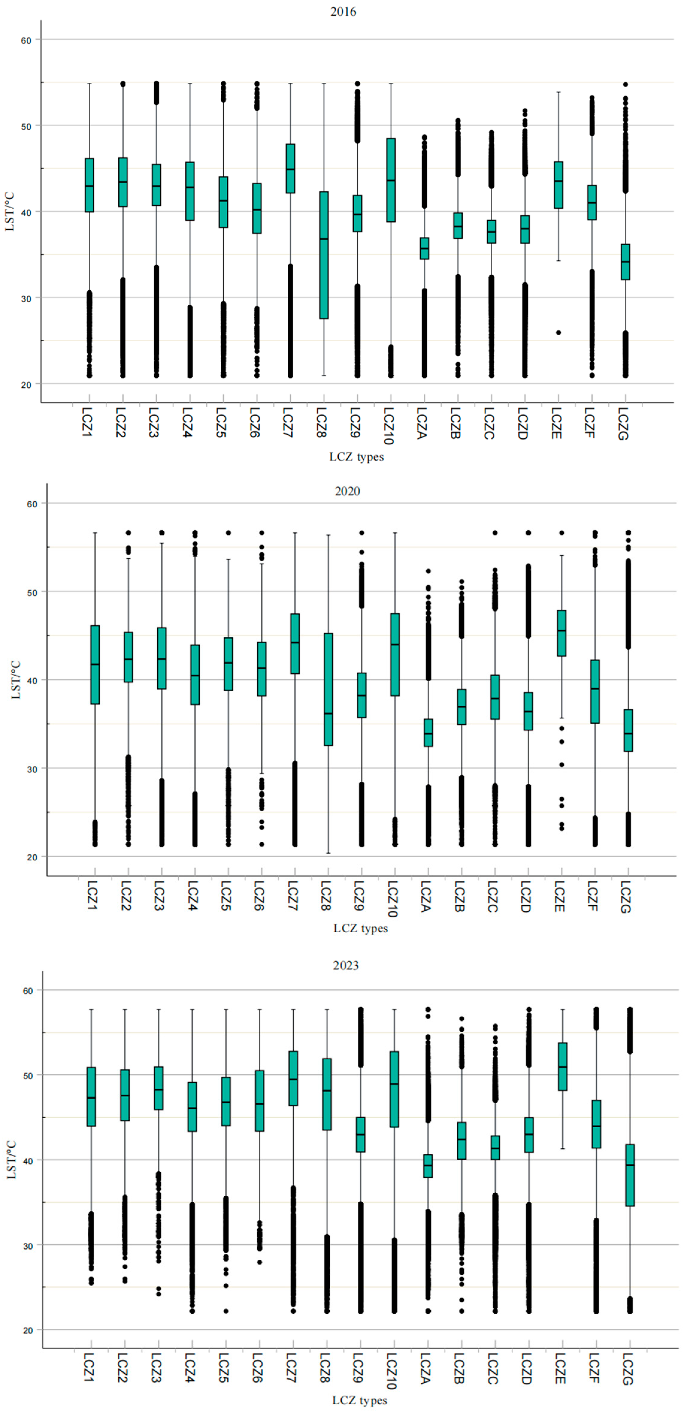 | Build Types | LST (°C) | LCZ Land Cover Types | LST (°C) | ||||||