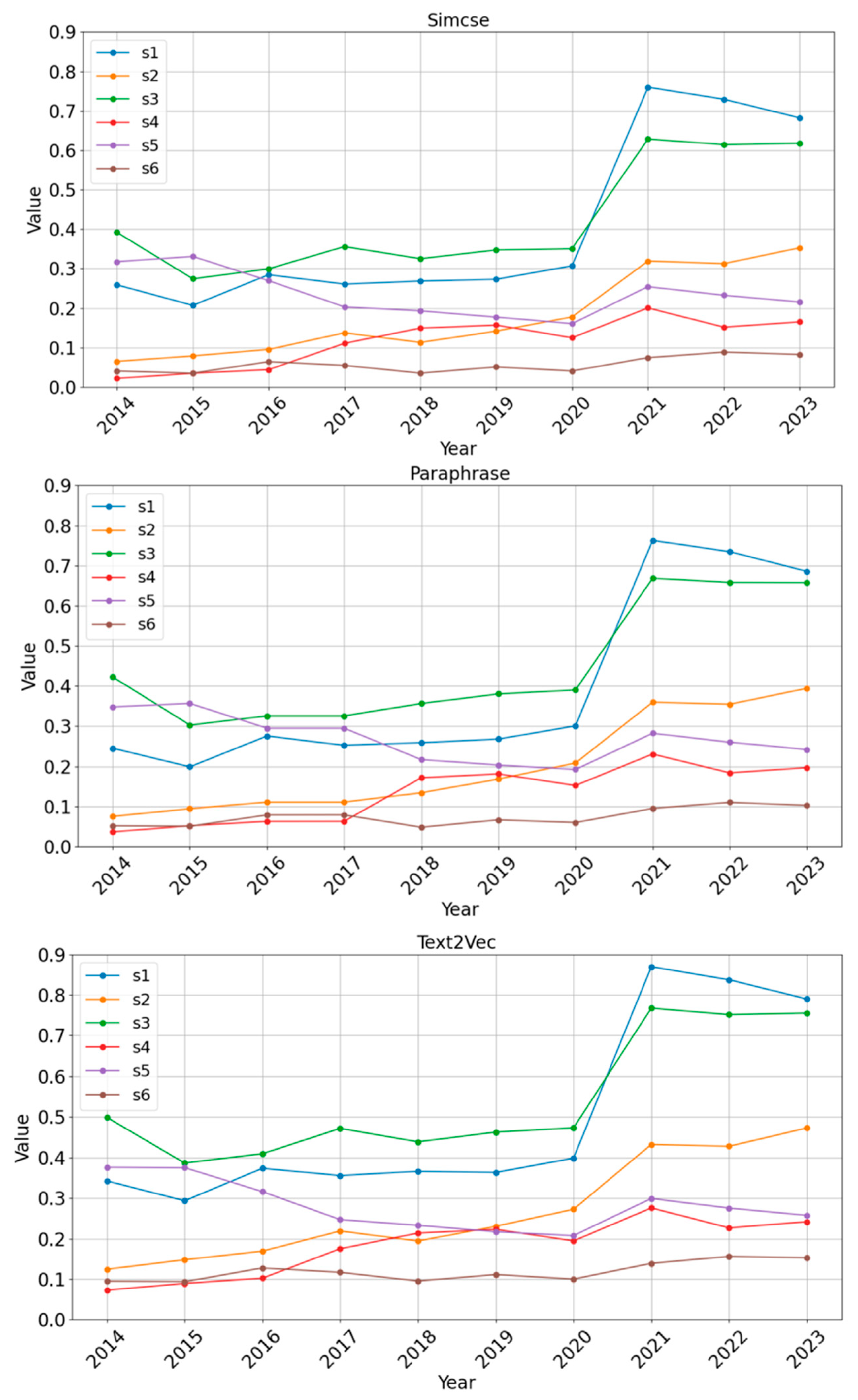 | Text2Vec | 0.2515 | 0.2309 | 0.2496 | 0.2641 | 0.2568 | 0.2680 | 0.2742 | 0.4639 | 0.4457 | 0.4450 |