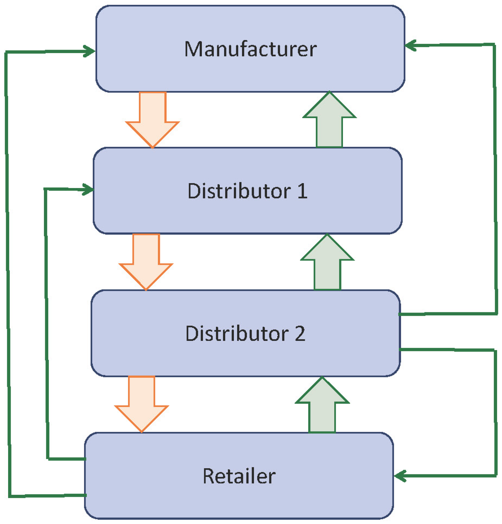 | Secondary distributor responds to retailer signal (information feedback strength). | Sharing POS data, communicating orders frequently, and engaging in collaborative planning increase , whereas delays, noisy signals, or limited information sharing decrease . | |