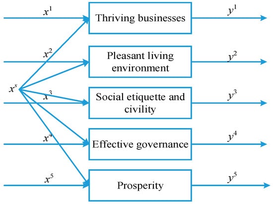 Recognizing that rural revitalization comprises multiple parallel subsystems drawing on a common pool of inputs, we measure efficiency using a shared-input global parallel DEA framework. This specification enables an explicit treatment of how shared inputs are distributed across parallel subsystems, which is not fully captured by conventional approaches such as network DEA or two-stage DEA [18]. In addition, the model constructs a single global production frontier using observations from all years, thereby reducing bias arising from interannual frontier shifts and enhancing the comparability of efficiency estimates across periods [20]. Related parallel DEA models have been extensively used to evaluate efficiency and productivity in sectors such as agriculture, transportation, and education [26,27,62,63,64]. In this study, rural revitalization inputs are organized into five categories, namely capital, labor, agricultural resources, education, and governance. Given the shared-input structure across subsystems, the corresponding input–output relationships are specified as illustrated in Figure 1.