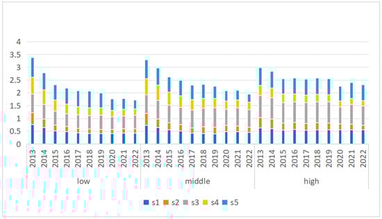 As reported in Figure 3, rural revitalization efficiency varies markedly with the level of economic development, with high-development regions consistently outperforming the medium- and low-development groups. This may be attributed to the more optimized resource allocation in these areas, which includes dimensions such as fiscal investment, infrastructure improvement, and human capital accumulation. Between 2013 and 2015, there is little change in rural revitalization efficiency, with a general trend of slow decline. From 2015 to 2019, a notable upward trend in rural revitalization efficiency is observed, largely due to the continuous improvement of the policy system, increased fiscal investment, accelerated infrastructure development, and enhanced human capital accumulation. In 2020, the COVID-19 pandemic causes a relatively sharp decline in efficiency values, but in the subsequent years, they gradually return to normal levels. In contrast to the steadily increasing rural revitalization development level [35], it is evident that the changes in rural revitalization efficiency do not exhibit a consistent upward trajectory. In regions with lower levels of economic development, the overall downward trend in efficiency persists. This trend indicates a potential gap between “quantitative growth” and “qualitative improvement” in the execution of the rural revitalization strategy. In other words, while increasing output has been prioritized, policymakers may have devoted insufficient attention to improving efficiency, optimizing structural arrangements and strengthening long-term sustainability.