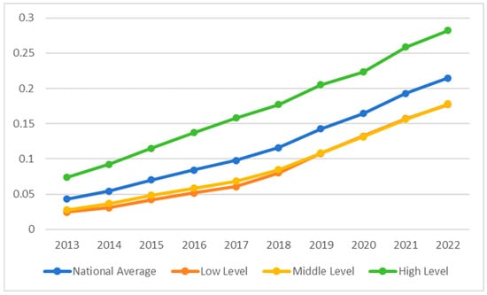 (2) Core Explanatory Variable (Level of Digital Economy Development). Drawing upon established indicator selection protocols [2,69,70], an evaluation index system for the digital economy is formulated, comprising three primary dimensions The detailed indicators are displayed in Table 2. This classification framework is consistent with mainstream measurement approaches in the digital economy literature and aligns with the availability and continuity of provincial-level data, thereby ensuring comparability across regions and years [71,72,73]. Specifically, the foundational prerequisites for digital advancement are reflected by the digital infrastructure dimension, while the growth status of digital industries is captured by digital industrialization. Furthermore, the depth of technology integration across other sectors is denoted by industrial digitalization. Collectively, a holistic and theoretically robust depiction of the digital economy’s development level is provided by this tripartite framework.
