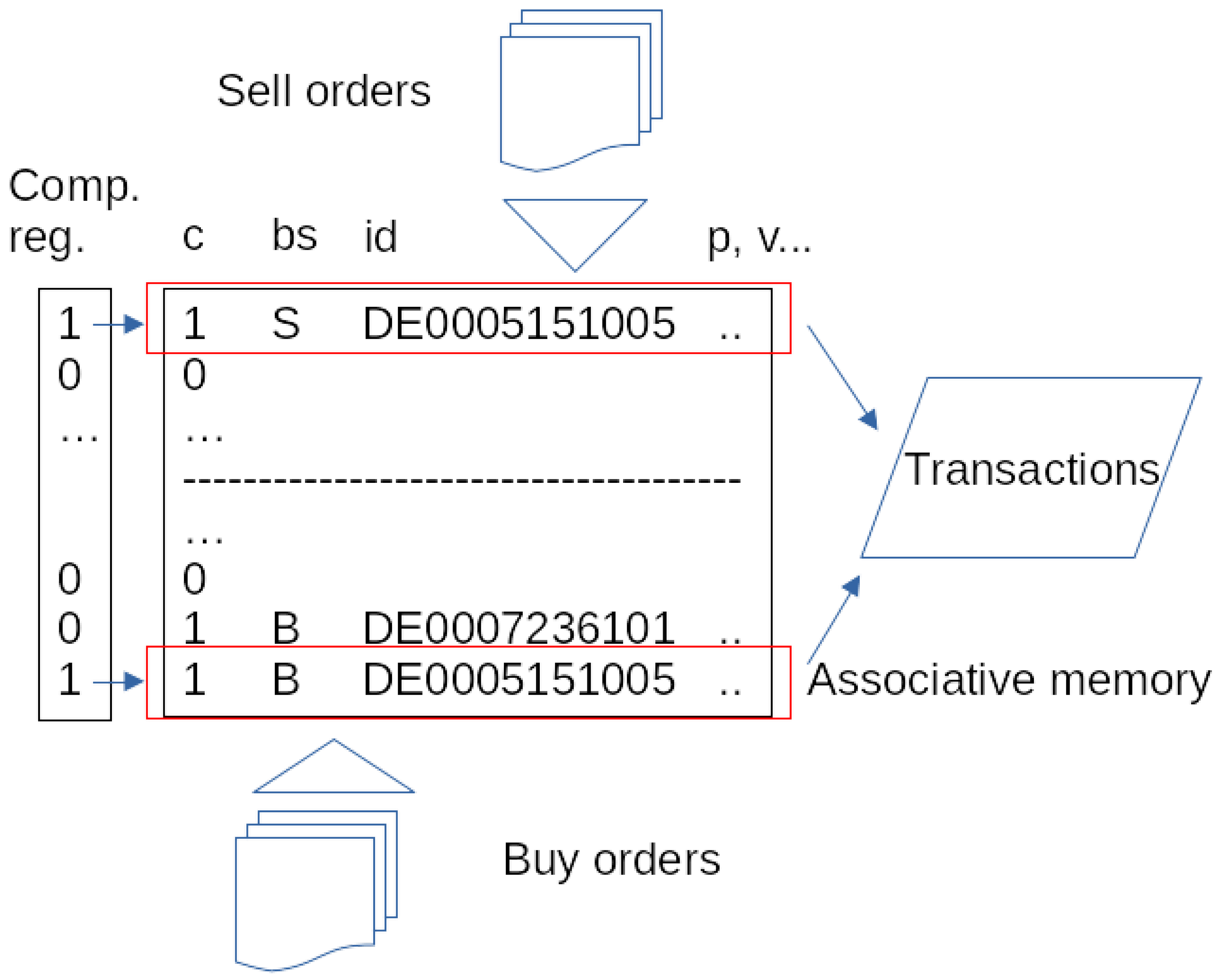 The presented solution may be extended to B2B e-marketplaces, where B2B transactions on buy/sell orders are handled in pretty much the same way, with the exception of not trading stocks identified by ISIN or e-currencies but goods identified by EAN codes. The differences in length between these identifiers may be overcome by appropriate organization of associative memory storage. Current KBP store arrays of associated user data, as lines of configurable lengths, viz. 32/64/128/256 bits (e.g., Broadcom’s Knowledge-Based Processor BCM15000 [