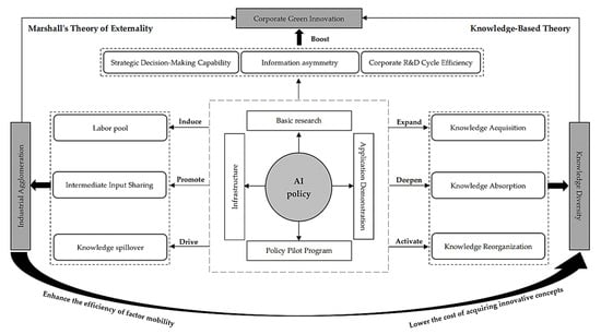 Marshall (1890) [32] proposed that the positive externalities generated by industrial agglomeration primarily stem from three core channels: labor pools, shared intermediate inputs, and knowledge spillovers. As a key vehicle for external policy influencing industrial agglomeration, the establishment of AI pilot zones prioritizes regions rich in scientific and educational resources, possessing solid industrial foundations, well-developed infrastructure, and clear supportive policies. This combination of locational advantages and policy empowerment effectively attracts relevant enterprises and innovation resources to cluster within the pilot zones, further strengthening regional industrial agglomeration and driving corporate green innovation [33]. First, regarding labor pools, establishment of AI pilot zones accelerates the clustering of related industries, thereby fostering specialized labor pools. This not only attracts a dense concentration of high-caliber talent in the AI domain but also propels comprehensive human capital upgrading across the pilot zones, laying a robust intellectual foundation and talent base to underpin enterprises’ eco-innovation. Compared to general labor, highly skilled talent possesses more systematic knowledge reserves [34] and better-aligned skill structures [35]. This enhances enterprises’ green knowledge integration capabilities and the efficiency of green technology absorption and transformation, ultimately achieving a leap in green innovation capacity. Second, regarding shared intermediate inputs, enterprises within AI pilot zones can leverage agglomeration advantages to share infrastructure such as AI computing power platforms, cloud computing platforms, and information service platforms [36]. This centralized resource allocation model alleviates cost constraints on corporate green innovation [37]. Simultaneously, policy-driven clustering of technical consulting, evaluation, and transformation services provides comprehensive intermediary support for corporate green innovation [38], empowering enterprises in this domain. Third, regarding knowledge spillovers, establishing AI pilot zones facilitates technical exchanges and collaborations among enterprises, research institutions, and AI industry associations. This directly reduces firms’ search and contract costs, promotes knowledge and technology flows, and generates knowledge spillover effects [39]. This enables enterprises not only to obtain complementary resources from other companies through R&D collaborations but also to absorb cutting-edge AI knowledge from research institutions and industry associations, thereby enhancing their own intelligence and ultimately driving the output of green innovation achievements [40]. Accordingly, the study tests the hypothesis that: