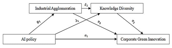 (2) Confirm that industrial agglomeration and knowledge diversity mediate the relationship between AI policy and corporate green innovation. Although existing research has explored potential pathways through which AI policy may influence corporate green innovation from various perspectives [59], these studies predominantly focus on single pathways or partial mechanisms. They have yet to examine the chain-like transmission process—“AI policy–industrial agglomeration–knowledge diversity–corporate green innovation”—simultaneously within an integrated framework. Therefore, this study incorporates industrial agglomeration from an environmental external perspective and knowledge diversity from a factor reallocation perspective into a unified analytical model. It examines the mediating effects through two distinct channels—“environmental driving” and “factor activation”—and adopts a chained mediation model to systematically uncover the multiple transmission paths via which AI policy affects corporate green innovation.