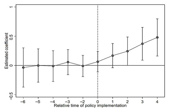 Adherence to the parallel trend assumption proves crucial for causal inference via the DID method. We leveraged an event study to examine whether the parallel trend held prior to the policy. Since counterfactual scenarios cannot be directly observed, the parallel trend assumption is difficult to verify directly [54]. This test typically entails verifying whether the coefficients for the pre-policy period fail to achieve statistical significance. The absence of significant coefficients across all pre-treatment periods upholds the parallel trend assumption, thereby justifying the adoption of the DID model. To verify the parallel trend assumption, we estimate the model specified in Equation (1). We further construct the dynamic regression model specified in Equation (11) for this purpose.