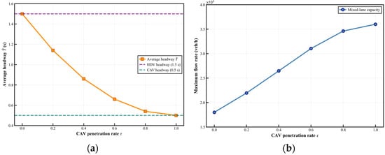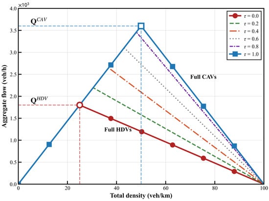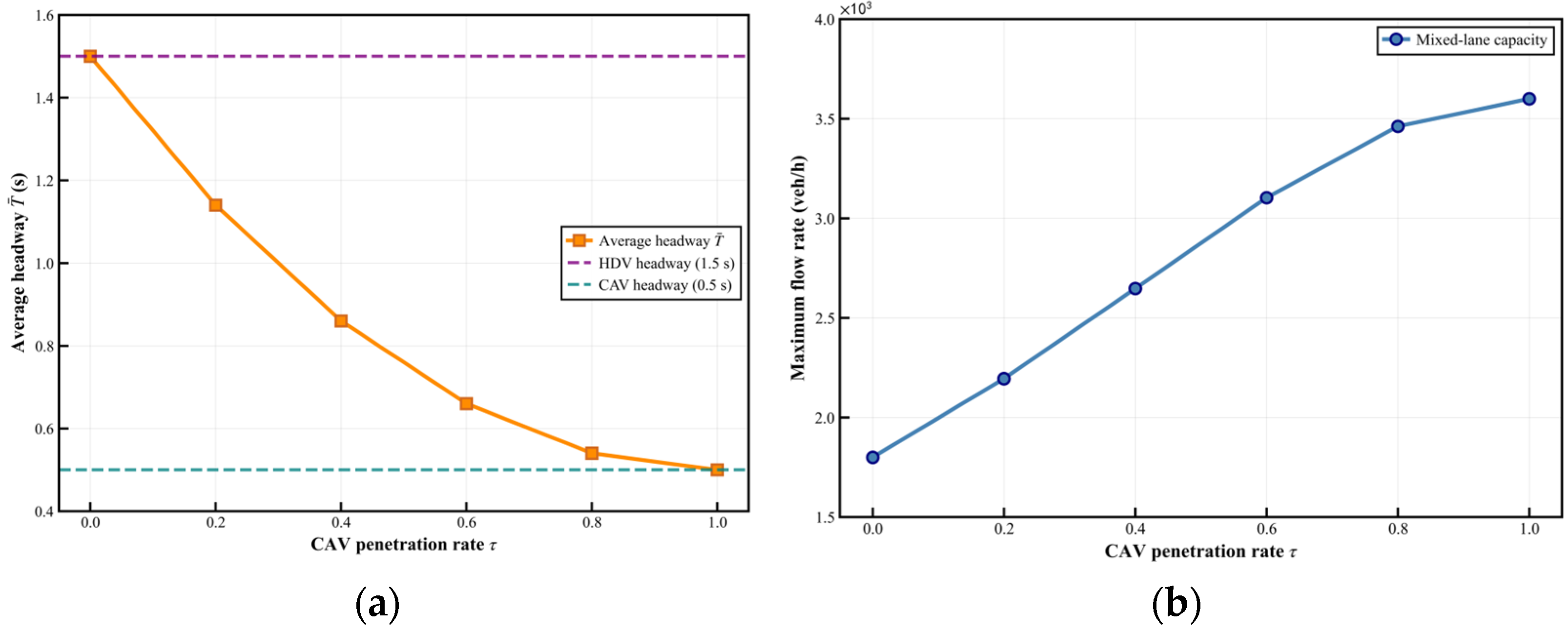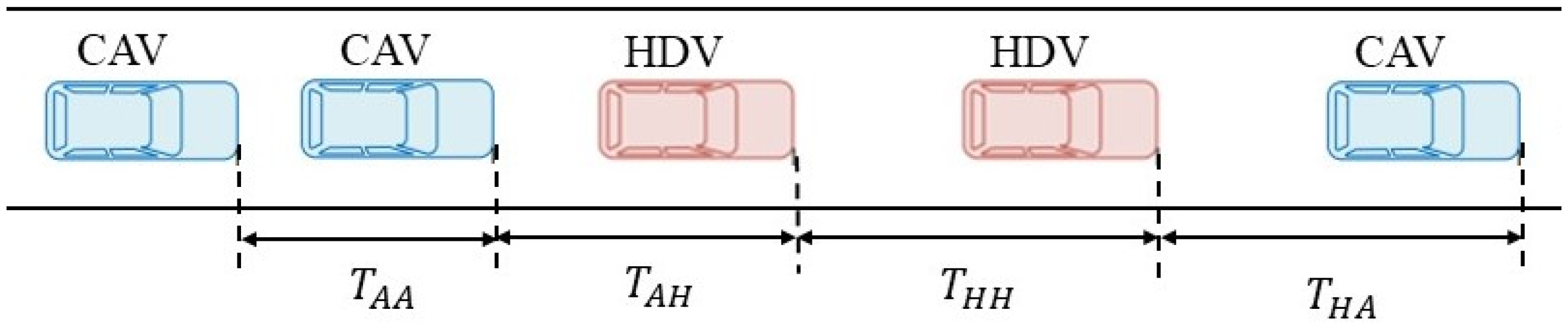 28]; (b) CAVs are assumed to possess connectivity and automation capabilities that enable shorter and more stable time headways compared to HDVs, as reflected in the capacity model (Equations (3)–(6)) and supported by studies on CAV impacts on traffic flow [