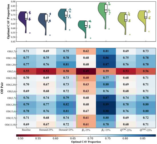 Figure 7 presents violin plots illustrating the distribution of optimal CAV proportions across the 12 OD pairs under different sensitivity scenarios. The lower part uses heatmaps to detail the numerical distributions for each OD pair.