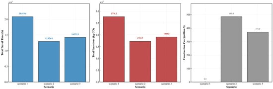 Scenario 3, the proposed multi-objective framework, was designed to address this limitation explicitly. It achieved significant improvements over the baseline, reducing TSTT and total emissions by 31.6% and 31.0%, respectively, while maintaining a construction cost of USD 371 million. The primary contribution of Scenario 3 is thus not necessarily outperforming Scenario 2 in every metric but in providing a balanced solution that maintains a high level of traffic efficiency and environmental benefit at a 23.5% lower cost. This offers planners a spectrum of options with different trade-offs rather than a single, potentially cost-prohibitive solution.