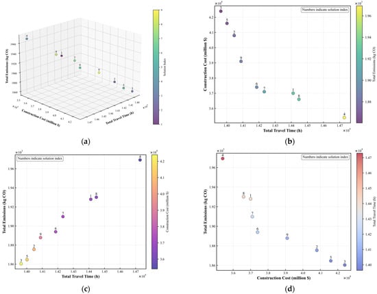 Figure 9 presents the Pareto front of nine non-dominated solutions from Scenario 3. The analysis confirmed the expected conflict between economic and performance objectives, while also revealing a strong positive correlation between TSTT and total emissions. A cost-threshold analysis indicated that performance gains were most pronounced with budgets below USD 380 million, with a plateau effect observed within the USD 370–390 million range.