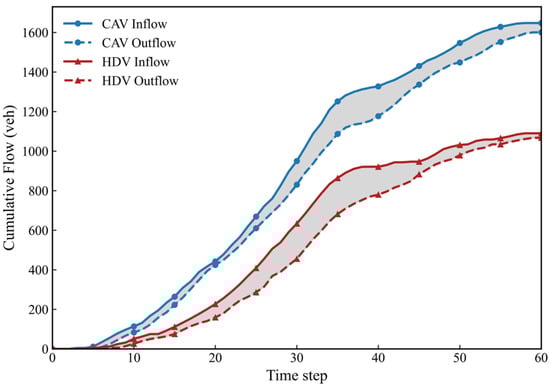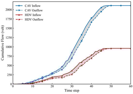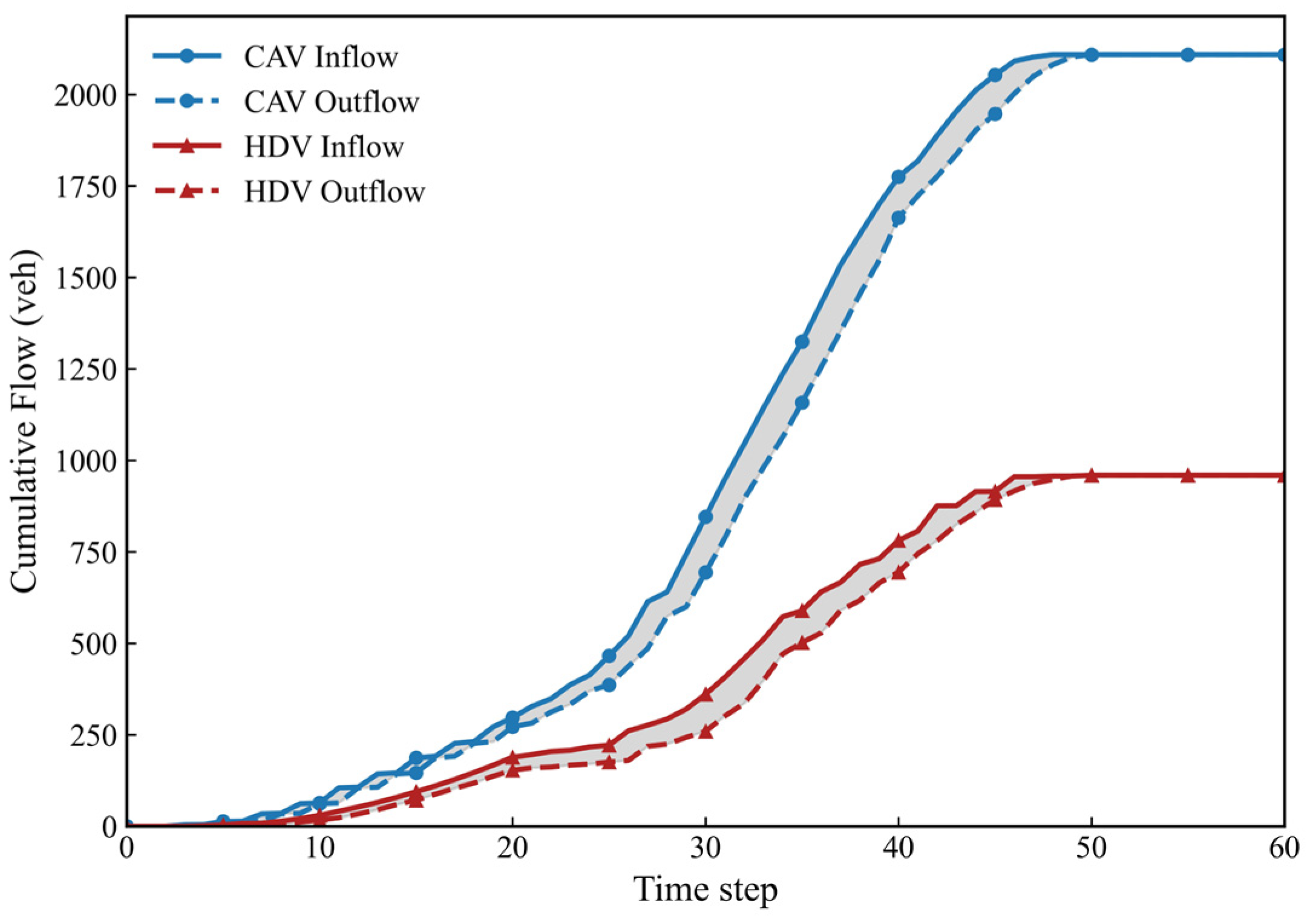 Cumulative inflow–outflow patterns on link (4, 5) revealed fundamentally different vehicle behaviors under mixed traffic (Scenario 1,