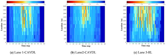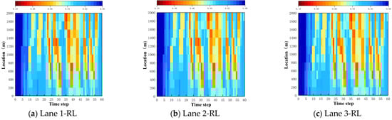 Figure 12), high-density regions appeared consistently across all three lanes during peak hours, with congestion spreading upstream to form large-scale contiguous congested areas. Owing to the limited capacity of RLs, congestion dissipated slowly, and high-density conditions persisted beyond time step 55.