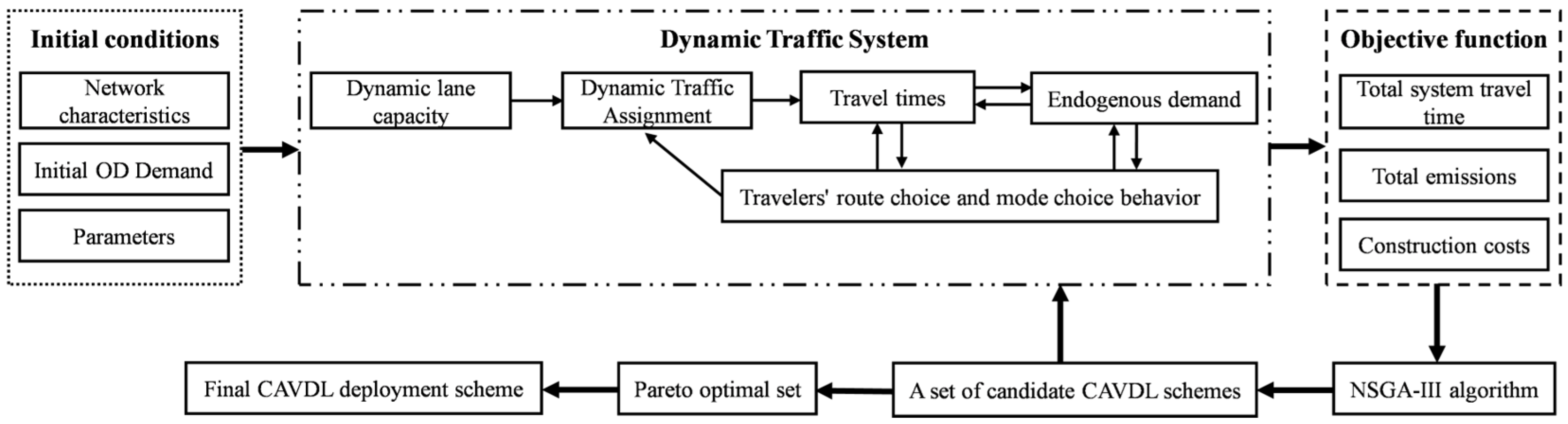 The proposed framework aims to simultaneously optimize three conflicting objectives: total system travel time (TSTT, ), total emissions (), and CAVDL construction costs ().