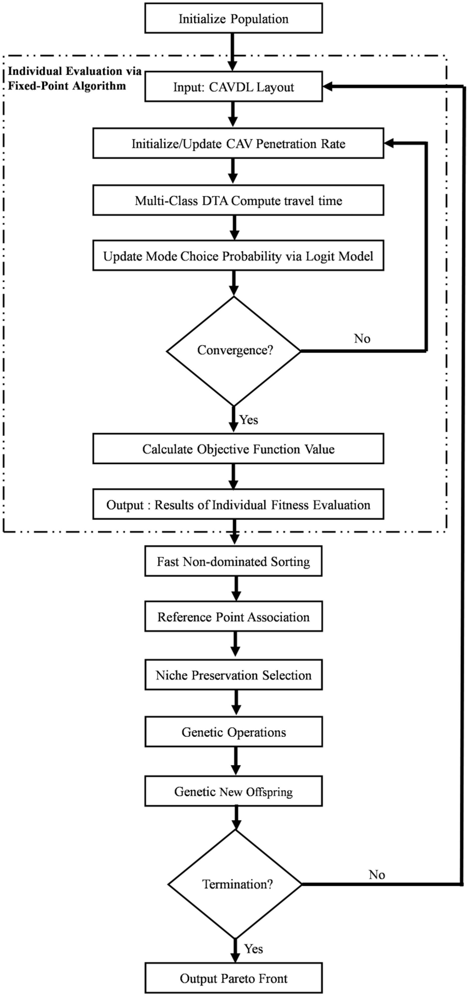 To efficiently solve this multi-objective mixed-integer nonlinear programming (MO-MINLP) problem, a two-layer solution strategy was adopted. The outer layer used the NSGA-III algorithm to optimize the binary lane allocation variables generating Pareto-optimal CAVDL layouts; this algorithm was selected for its ability to handle multiple objectives and maintain diversity in high-dimensional objective spaces. The inner layer employed a fixed-point algorithm to solve for the equilibrium CAV penetration rate by iteratively updating the logit-based mode choice model until convergence, and this step ensured consistency between travel demand and network performance.