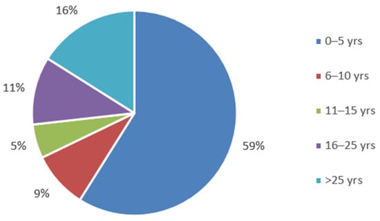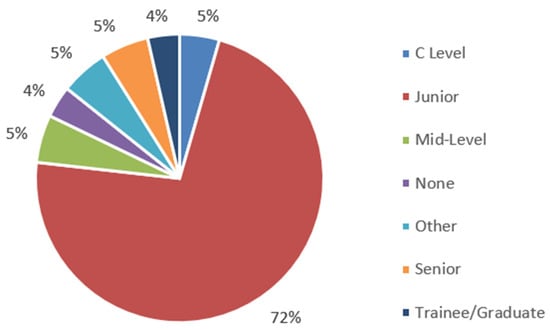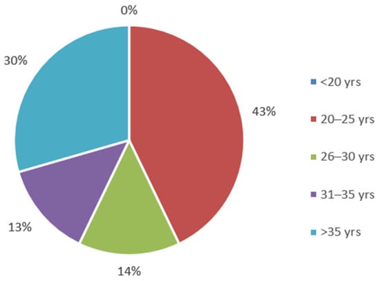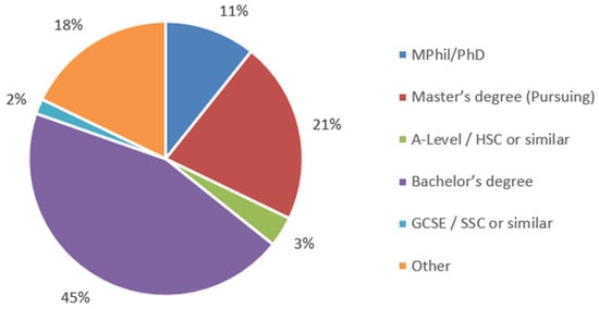 Figure 1 shows 112 responses to Q1. Therein, the top three countries represented were India (43%), the UK (23%), and China (16%). Moreover, 68% of the respondents had completed their master’s in India and 32% in the UK. Figure 2 shows that 43% of the students were between 20 and 25 years of age, 25% of the students were between 26 and 35 years of age, and 30% were over 35 years of age. Figure 3 shows that the students predominantly had 0 to 5 years of experience (59%), accompanied by an even spread of professional roles (Figure 4), 72% of which were at a junior level (Figure 5) and 76% of which had gained bachelor’s degrees and were pursuing an MSc (Figure 6). Over half of the respondents (56%) were of chartered status—reflecting significant expertise in the field of engineering (Figure 7).
