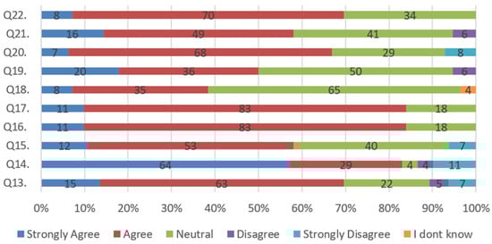 Questions 13 to 22 are designed to identify if there is a widely accepted understanding of the definition and practices of Construction 4.0. Students were given five choices from strongly agree to strongly disagree. The questions posed and the results obtained can be seen in Section 4.3.