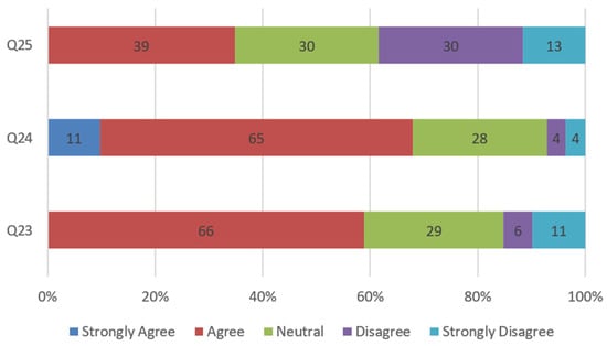 Questions 23 to 25 focused on the awareness, understanding, and exposure of the MSc students to Construction 4.0, focusing down from the general construction industry to the individual MSc students. Students were given five choices from strongly agree to strongly disagree. The questions posed and the results obtained can be seen in Section 4.4.