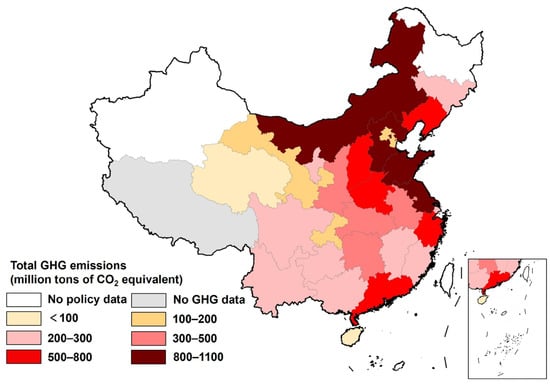 Carbon peaking implementation plans are issued by people’s governments at various levels. Due to the characteristics of China’s administrative system, data transparency across government levels is limited [28]. To comprehensively collect publicly available policy texts, this study employed an exhaustive approach, systematically retrieving and gathering documents through multiple public channels [29], including official government websites, the China Carbon Neutrality Network (https://www.ccn.ac.cn/), and the PKULAW database (https://www.pkulaw.com/). As of 30 October 2025, a total of 316 publicly released policy texts were collected, comprising 1 national-level document (Plan), 24 provincial-level documents, 149 municipal-level documents, and 142 county-level documents. Figure 1 shows the total greenhouse gas (GHG) emissions of the provincial-level administrative regions that have released documents. It should be noted that the data only include policies that are publicly accessible. The absence of retrieved documents for certain regions does not necessarily indicate the absence of such plans; it may be the result of unpublished information or restricted access channels. Therefore, this study has objective limitations in coverage, such as potential geographical representation bias and policy completeness bias, which may affect judgments about the completeness of the national policy layout and the analysis of the entire policy evolution process. Although the existing database cannot encompass all policies from all provinces, cities, and counties, it is sufficient for conducting relevant analyses.