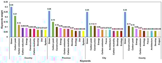 Keywords from carbon peaking policies at the national, provincial, municipal, and county levels were extracted using Jieba segmentation to analyze the policy focus and orientation (Figure 2). Firstly, “green”, “carbon peak”, “energy”, and “construction” are core keywords, indicating that promoting carbon reduction through green transition and energy transformation has been deeply integrated into the national governance system [48]. Furthermore, national and provincial levels focus on coordinating resources through a planning “system”, while municipal and county levels emphasize grassroots construction terms such as “architecture”, “ecology”, and “project”, e.g., through solar power generation projects and ecological restoration projects. This reflects the action pathways of local governments in achieving the SDGs based on local conditions.