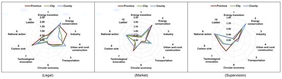 Systematic differences exist in the use of policy instruments across different government levels [49] (Table 3). The use of legal instruments decreases with lower administrative levels, aligning with China’s top-down power structure [50]. Market instruments are most prominent at the provincial level, reflecting that provincial governments, as regional coordinators, rely more on economic measures to balance emission reduction and growth, such as government procurement [51] and green finance [52]. Supervision instruments increase progressively down the hierarchy, indicating that grassroots governments focus more on policy implementation and outcome assurance.