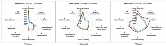 Policy target setting showed significant hierarchical differentiation (Table 4), which is essentially an inevitable outcome of the layered operation of China’s governance system [54]. Provincial and municipal policy targets exhibited the highest precision, undertaking the crucial function of translating national strategies into executable and assessable specific indicators. National-level targets maintained greater ambiguity, leaving necessary space for differentiated local implementation, reflecting the application of the “common but differentiated responsibilities” principle in multi-level governance [55]. County-level target precision was relatively limited, reflecting the practical constraints in data foundations and governance capacity at the grassroots level [56].