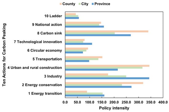 Among the carbon peaking implementation plans issued by various governments, the Ten Major Actions for carbon peaking are regarded as key tasks and are consistently integrated throughout the entire process and all aspects of economic and social development. Specifically, they are integrated as follows: (1) green and low-carbon transformation of energy (energy transition), (2) energy conservation, carbon reduction, and efficiency improvement (energy conservation), (3) carbon peaking in the industrial sector (industry), (4) carbon peaking in urban and rural construction (urban and rural construction), (5) green and low-carbon transportation (transportation), (6) a circular economy to support carbon reduction (circular economy), (7) green and low-carbon technological innovation (technological innovation), (8) consolidation and enhancement of carbon sink capacity (carbon sink), (9) green and low-carbon actions for all (national action), and (10) orderly carbon peaking actions in various regions in a phased manner (ladder). When analyzing the characteristics of the 10 major actions, we strictly followed the name definitions in the “plan”. Some regional policies have different expressions of and definitions for each action, and they were not included in this analysis.