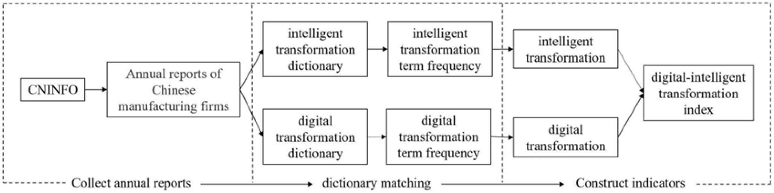 The construction process of the digital–intelligent transformation index is as follows: First, annual reports of Chinese manufacturing firms from 2001 to 2023 are retrieved from The Information Disclosure Website designated by the China Securities Regulatory Commission (CNINFO). After removing non-compliant and duplicate reports, the remaining reports are converted into text format. Second, the Python jieba -0.42.1 segmentation tool is used to tokenize the text, incorporating the pre-constructed digital–intelligent transformation dictionary, and keyword frequencies are counted. Finally, the keyword frequencies for digital–intelligent transformation are summed, one is added to each sum, and the natural logarithm is taken; the interaction term of the two logged values is used as the digital–intelligent transformation index (AIDX). The detailed procedure is illustrated in