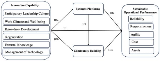 Innovation capability is increasingly recognized as a form of dynamic capability that enables firms to adapt, transform, and respond to evolving market conditions [37]. According to dynamic capability theory, such higher-order capabilities do not directly drive performance outcomes, but rather exert influence by shaping and guiding the deployment of operational strategies and capabilities [12,40]. In rapidly changing environments, characterized by shifting customer demands and technological advancements, the ability to develop and adapt products has become a critical operational competence necessary for organizational survival and success [45]. Building on this perspective, ref. [41] highlights that the mechanisms in platform-based supply chain management, such as business platforms and community building, can be viewed as key operational capabilities that enable firms to deliver offerings efficiently and responsively to end-users. Without these mechanisms, firms may struggle to maintain customer engagement and risk losing market relevance or face business failure. Therefore, consistent with the tenets of dynamic capability theory, this study posits that innovation capability guides the development and effective use of business platforms and community-building strategies, which in turn serve as indirect mechanisms that enhance sustainable operational performance.