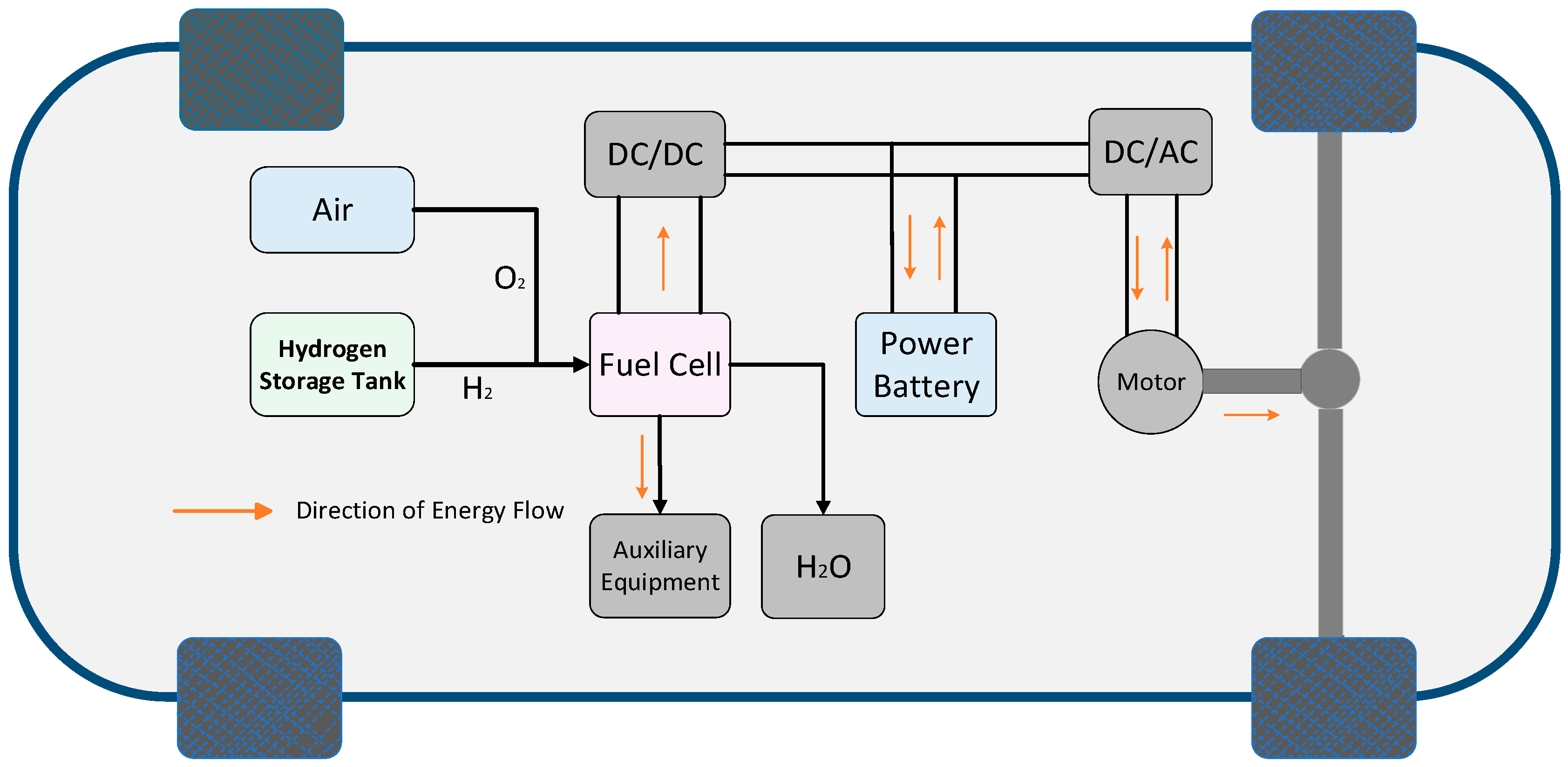 32], the EMS can significantly improve the hydrogen economy and enhance the system synergy efficiency (e.g., extending component lifespan and reducing powertrain fluctuations) by optimizing the power distribution between the fuel cell and energy storage system, with mainstream technical approaches categorized into the Equivalent Consumption Minimization Strategy (ECMS) and its improved variants, as well as Model Predictive Control (MPC). Firstly, the traditional ECMS achieves instantaneous optimization by equating battery charge-discharge energy to hydrogen consumption via a fixed equivalence factor, yet it struggles to adapt to complex dynamic working conditions—a study by He et al. [