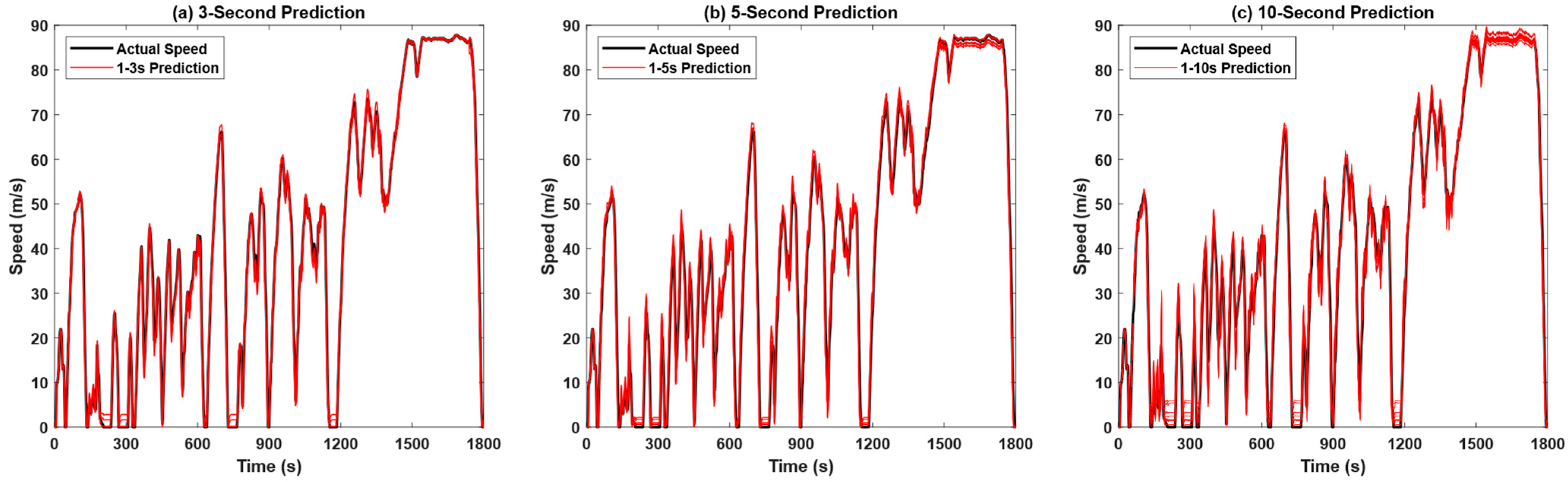 34]. This results in suboptimal control decisions and a lag in energy management, ultimately leading to higher hydrogen consumption. To address that issue, this paper proposes an improved Predictive Equivalent Consumption Minimization Strategy (P-ECMS). This strategy retains the core framework of real-time equivalent factor optimization in A-ECMS while incorporating short-term vehicle speed prediction capabilities. By using short-term predicted vehicle speed data to obtain the future short-term operational trend, this trend is then incorporated into the equivalent factor regulation formula to correct the equivalent factor, forming an optimization approach that can not only perceive the current state but also predict future working conditions. This enables decisions to be both responsive and forward-looking. Considering that vehicle speed has a significant impact on power demand and energy consumption, this strategy divides driving scenarios into low-speed, medium-speed, and high-speed intervals. Within each interval, the equivalent factor is adjusted based on changes in short-term predicted vehicle speed, improving the matching degree of energy distribution and subsequent driving conditions. Ultimately, under complex and variable driving conditions, power distribution decisions become more reasonable and adaptable, while also enhancing hydrogen consumption economy and overall system efficiency.